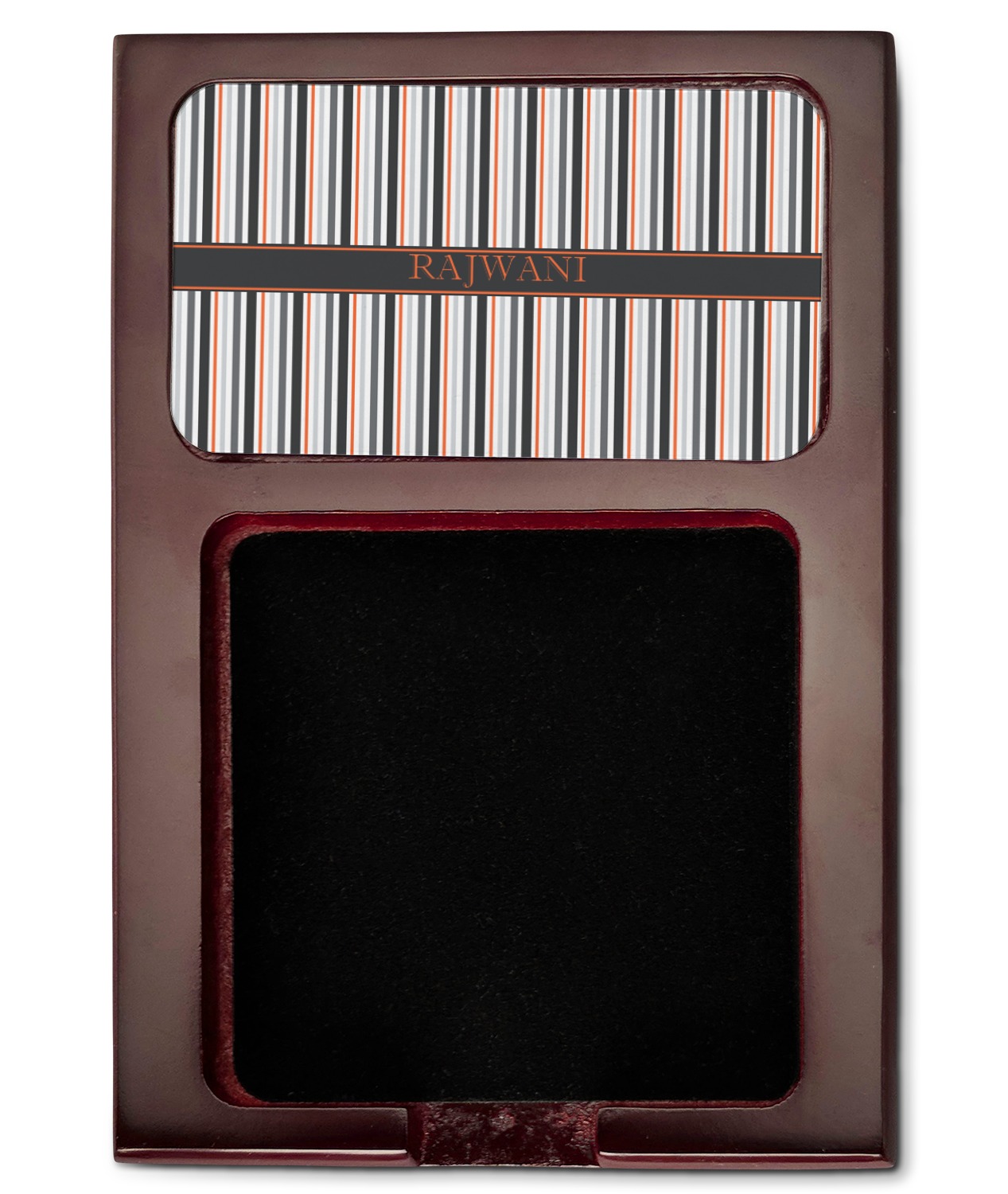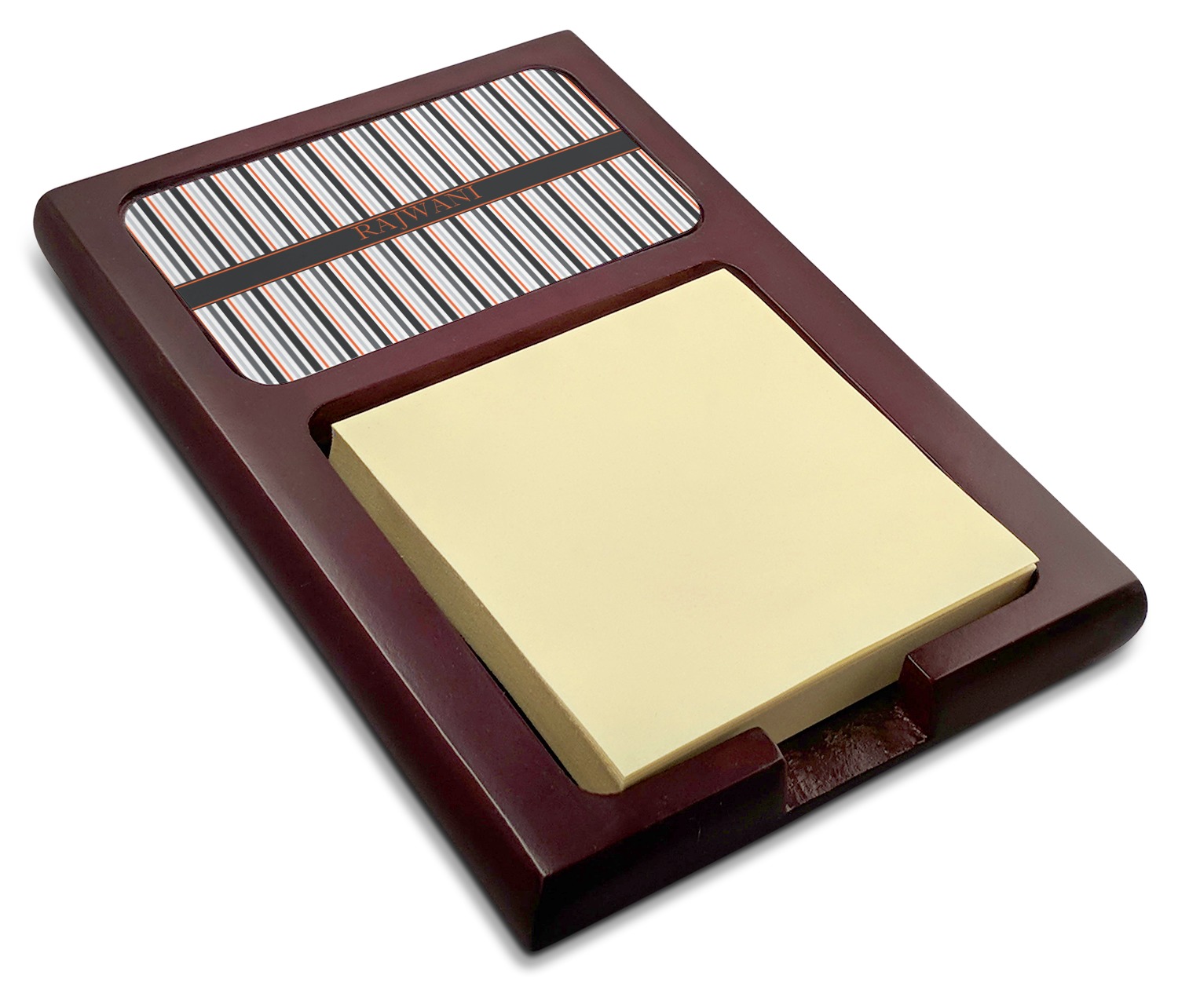 Crafted from a fine mahogany, this post it note holder is in the shade of a dark, cherry color. The dispenser itself is about 4.25 by 6.25 by 0.75 inches. You can place your 3 by 3 inch sticky notes in the indentation below the nameplate. We print your customization onto the nameplate that rests above the velvety indentation.