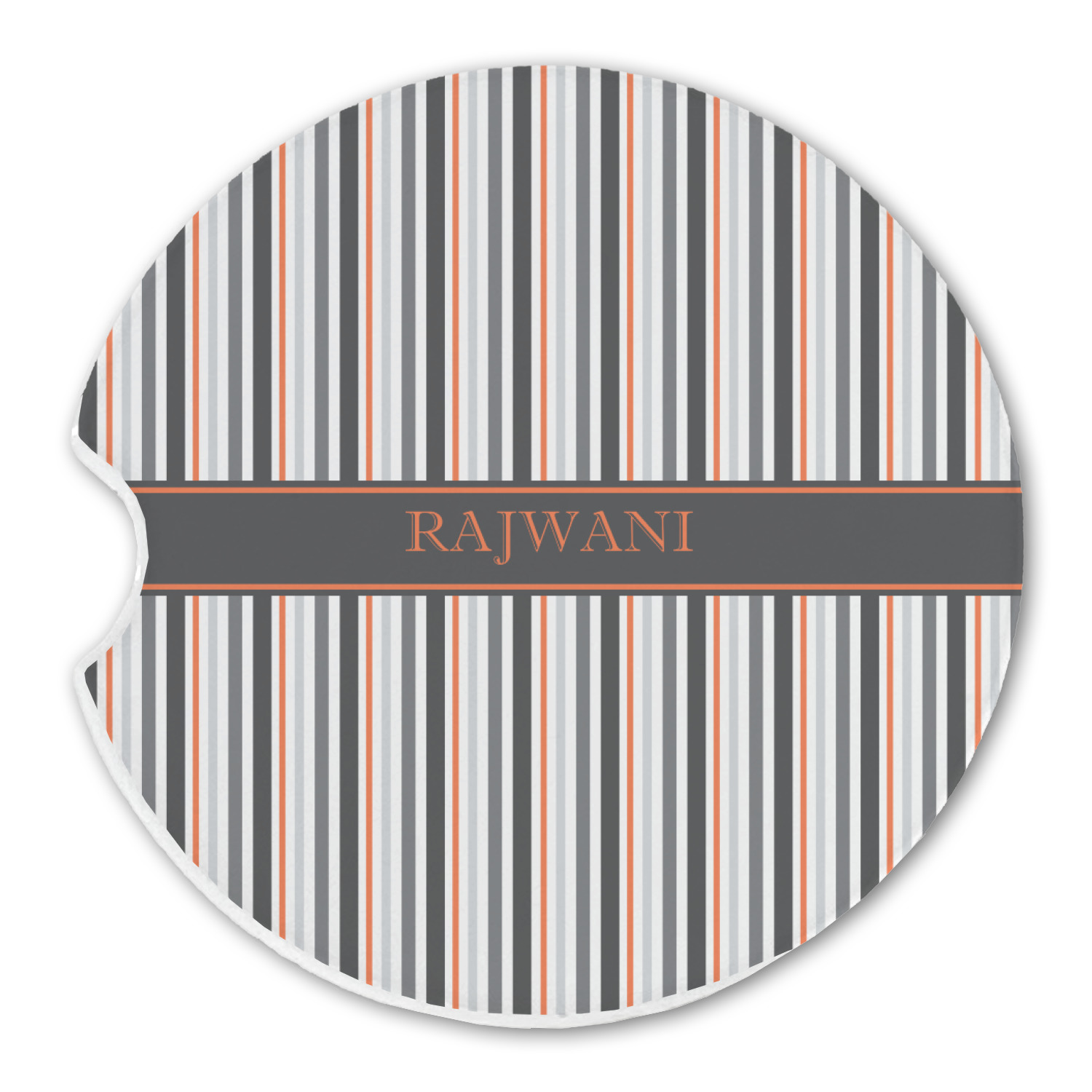 A wide band of black with a orange trim pulls the design together. This band adds a modern touch and provides the focal point for personalization of your choice.