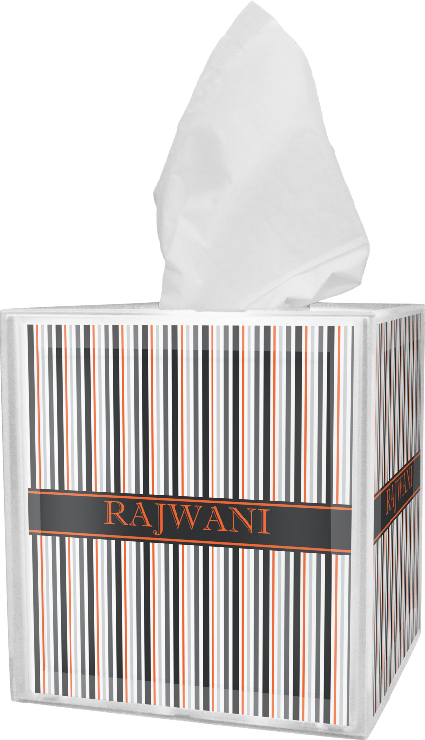 These tissue holders are built from durable acrylic and display your unique personalization on fine-quality vinyl inserts placed within the four sides and top. The box features two pieces, allowing you to easily switch out tissue boxes. On the sides, youll find ridges that ensure the top and base fit securely in place. The bottom of these tissue box holders has four, rubber, non-slip pads to prevent the box from scuffing any surface you decide to display it on. Each box can fit a standard 5 by 5-inch box of tissues.