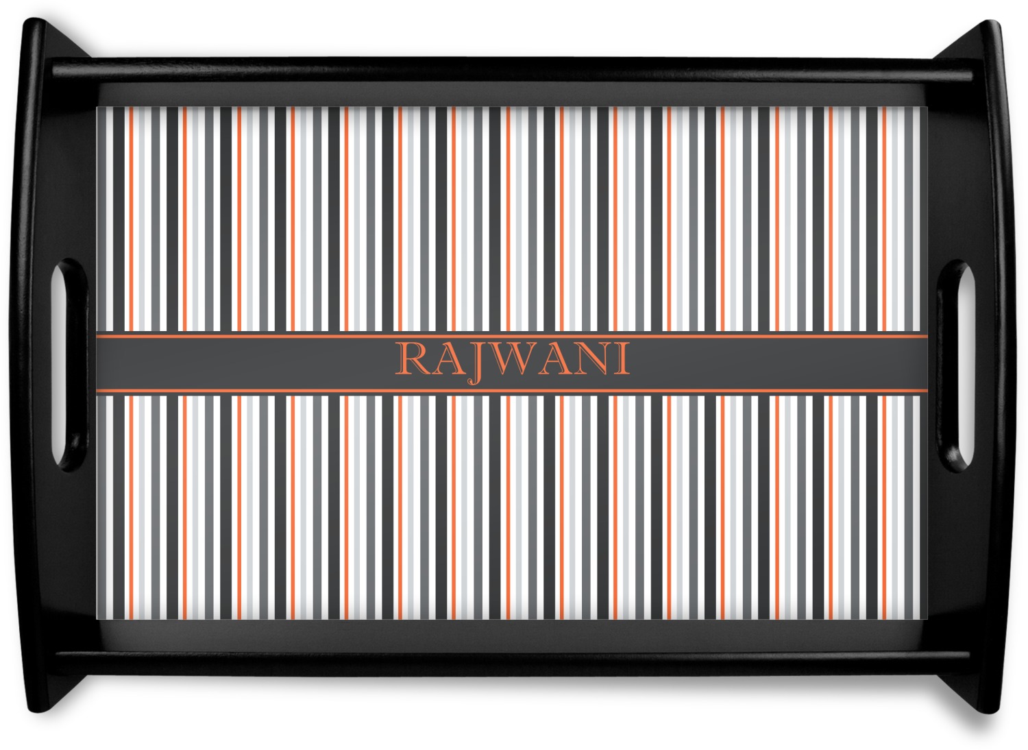 A wide band of black with a orange trim pulls the design together. This band adds a modern touch and provides the focal point for personalization of your choice.