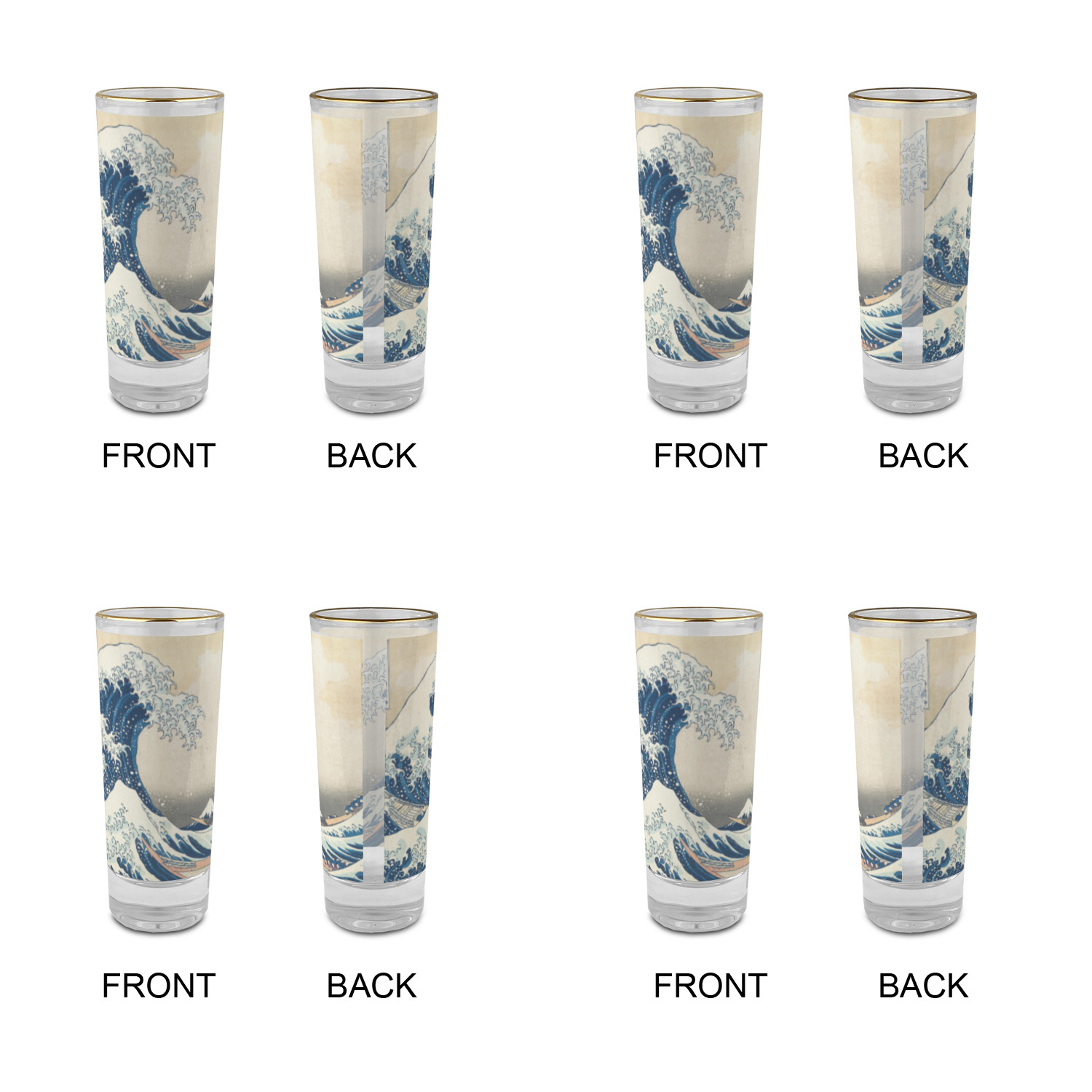 These glass shooter glasses are printed in full color with the design of your choice. These are a tall shooter 2 oz size and stand 4" tall. The print is a full wrap design to boldly display your personalization.
