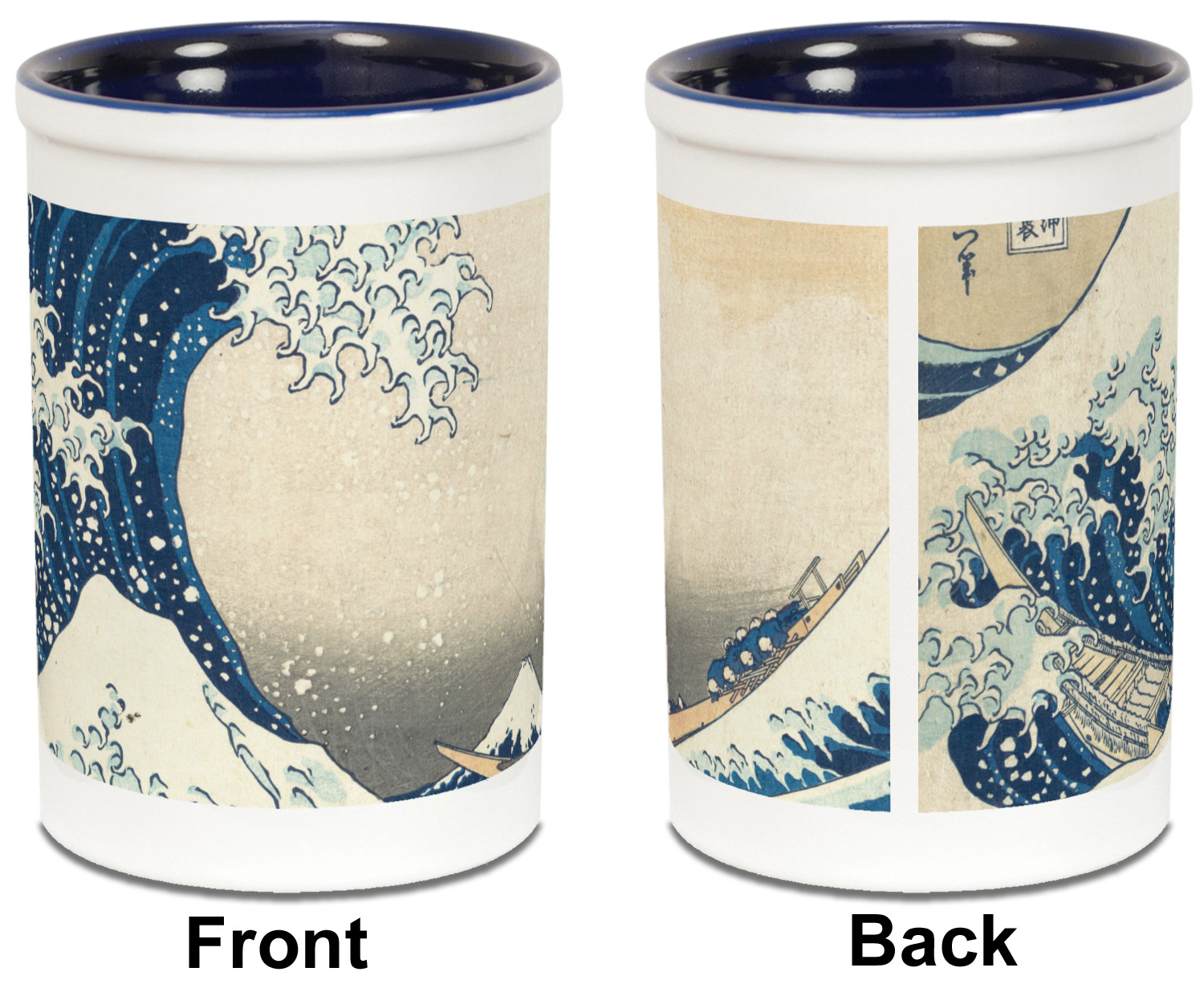 Both the blue and black pencil holders are a ceramic material, giving you a sturdy and long-lasting pen and pencil holder. We print your designs on the exterior of the pencil cup, covering most of the outside surface. There is a small white border on the top and bottom of the exterior of the pen holder, setting apart your design from the interior's color. Our ceramic pen caddy is roughly 3.5" x 3.5" x 5" in dimensions.