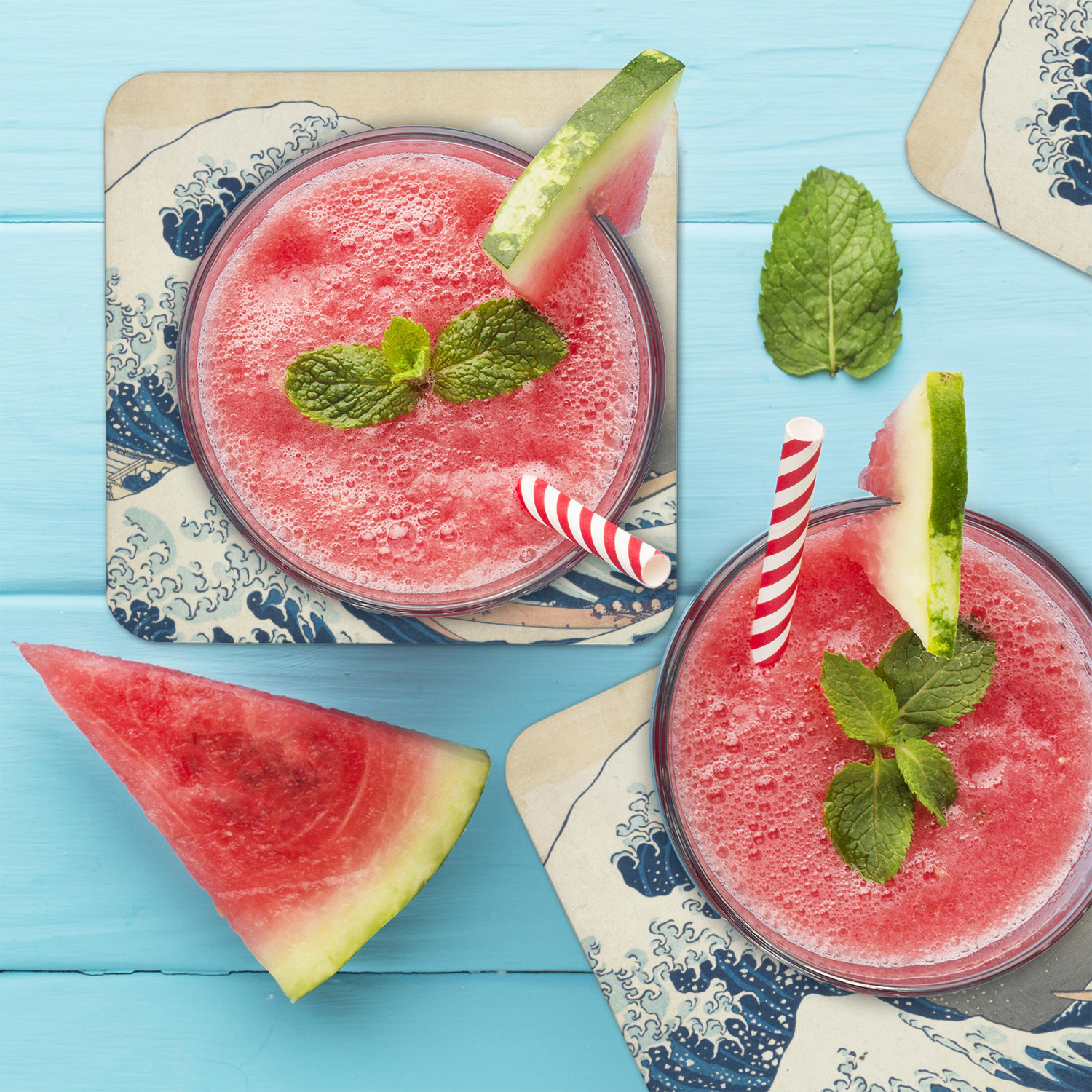 Your custom coasters have a smooth, laminated top and a cork bottom to prevent any unwanted slippage. We print your customized design atop this laminated surface, in bright and vibrant colors.