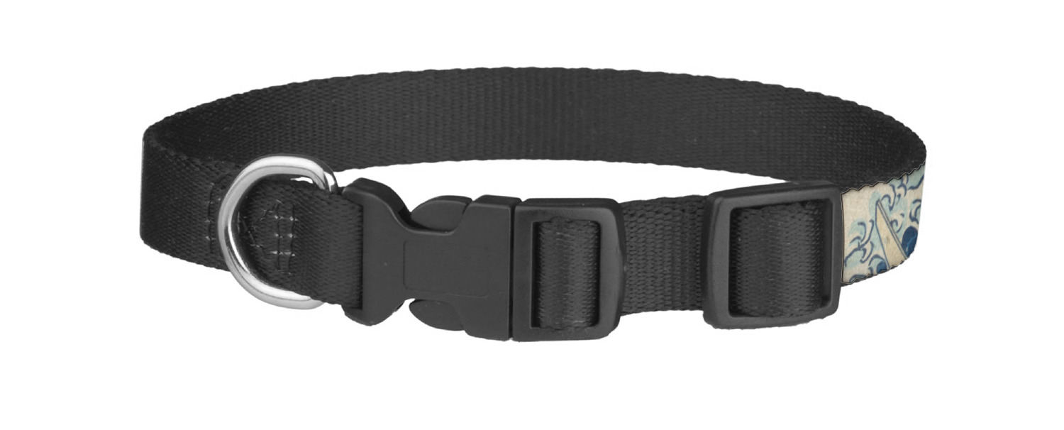 We offer these custom dog collars in two sizes: small and large. Our small dog collar, suitable for Pugs, Corgis, Beagles, and many others, is 10" to 16" long and 0.75" wide. Our large size fits Collies, Labradors, and Standard Poodles and other larger dogs (to name a few), and is 15" to 22" long, and 1" wide.