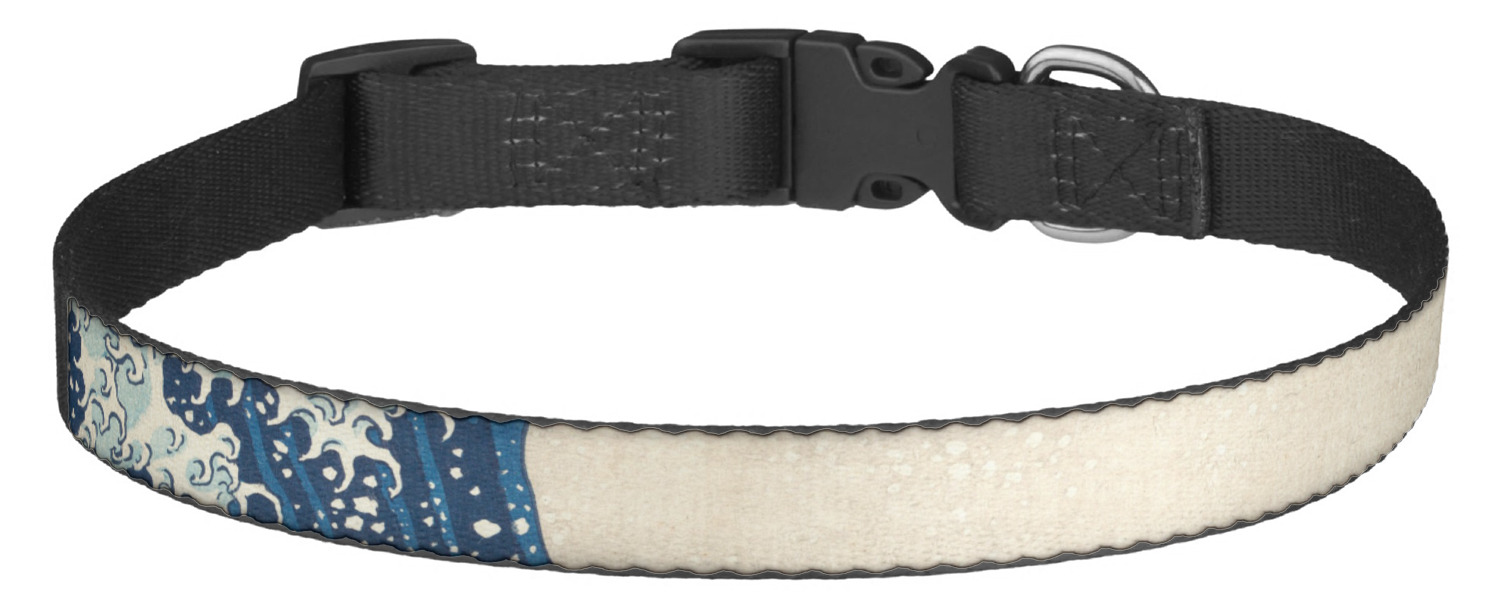 We offer these custom dog collars in two sizes: small and large. Our small dog collar, suitable for Pugs, Corgis, Beagles, and many others, is 10" to 16" long and 0.75" wide. Our large size fits Collies, Labradors, and Standard Poodles and other larger dogs (to name a few), and is 15" to 22" long, and 1" wide.