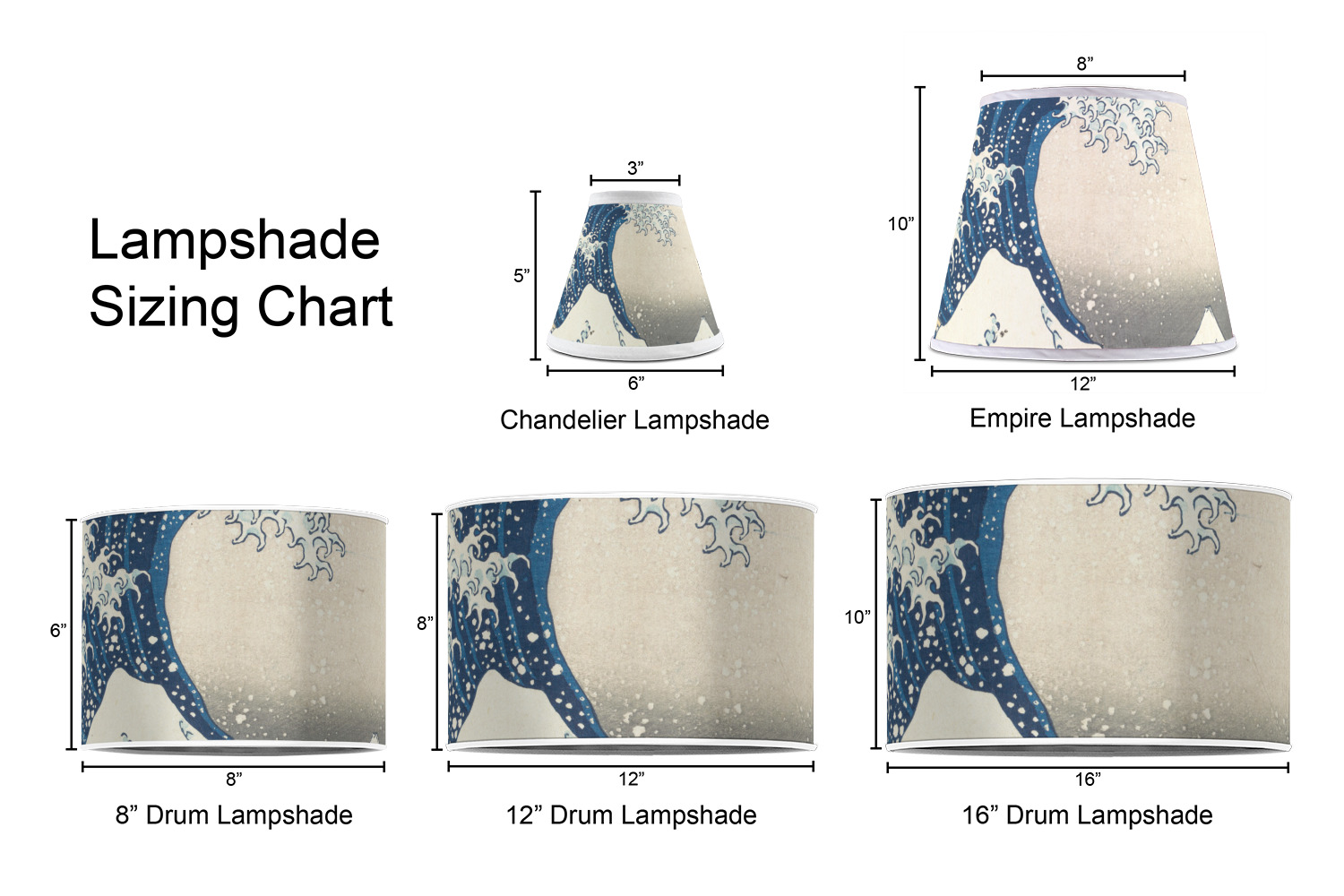 Our customized lamp shades also come in 3 different sizes: 8", 12" and 16", measuring at 8" in diameter by 6" tall, 12" in diameter by 8" tall, and 16" in diameter by 10" tall, respectively.