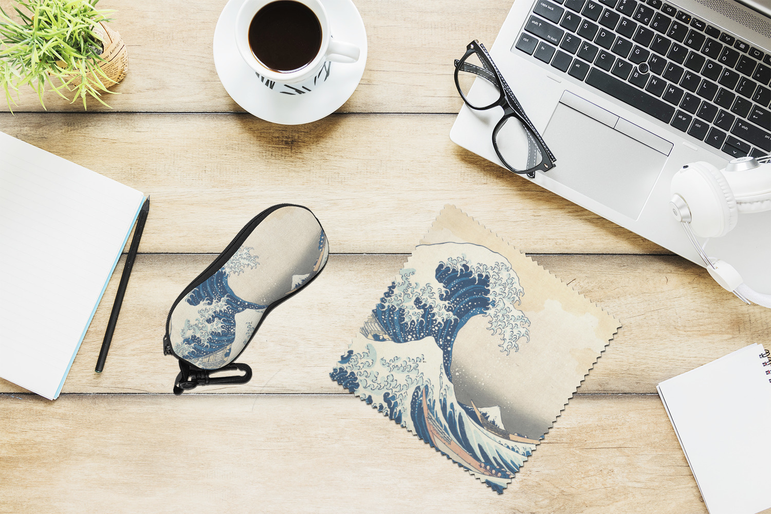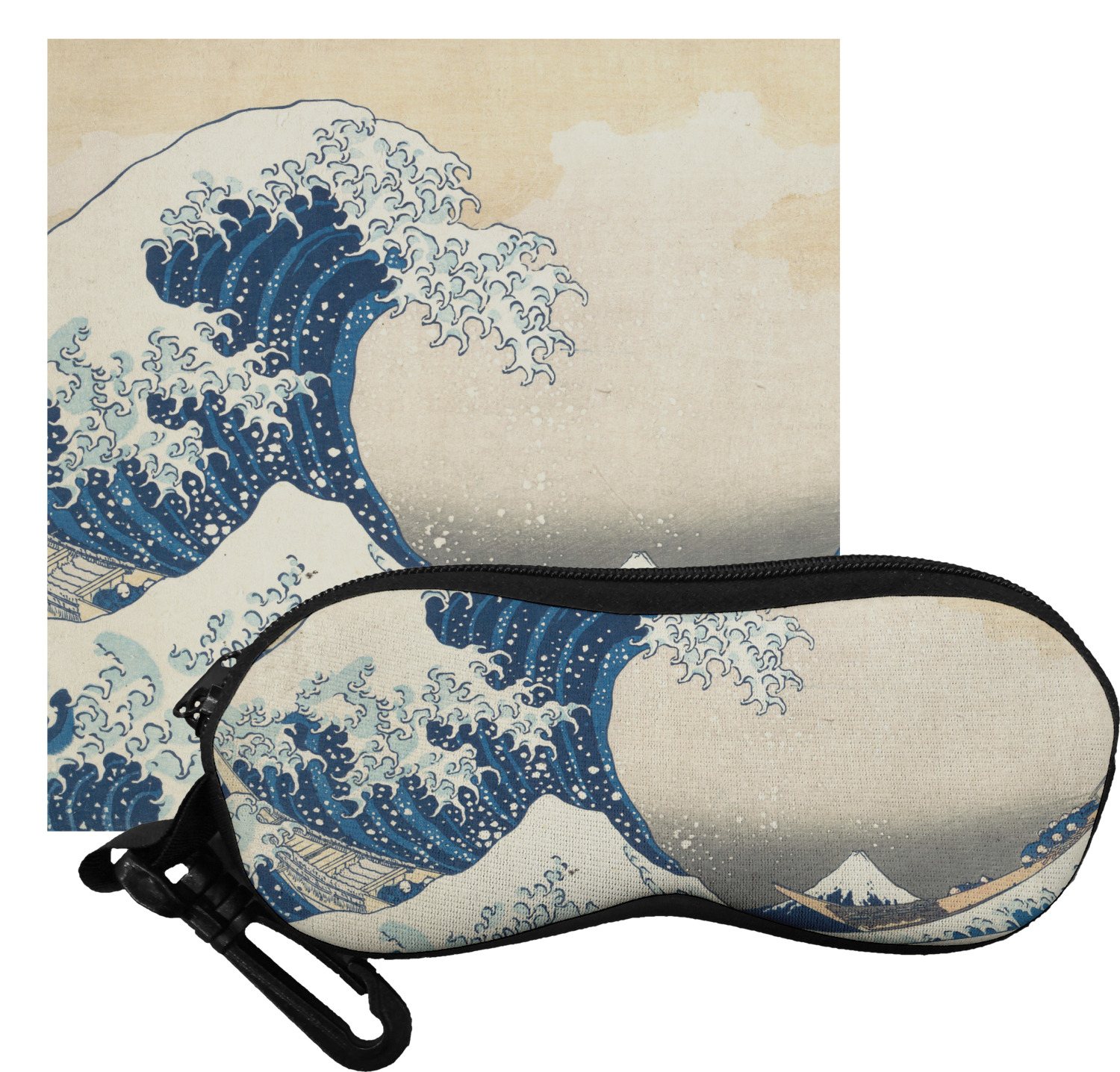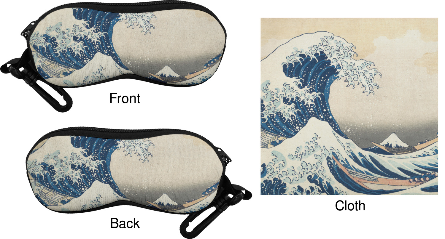 The cases have the design on both sides, a black zipper, and clips for hanging on a belt buckle or purse strap and also include matching lens cloths.