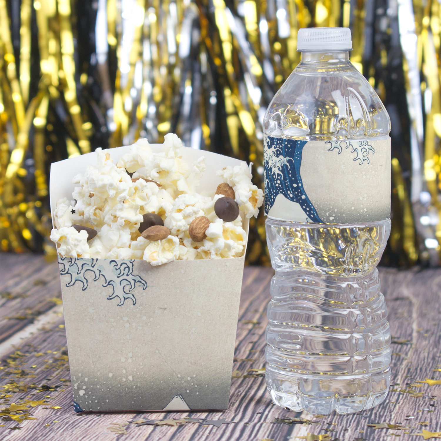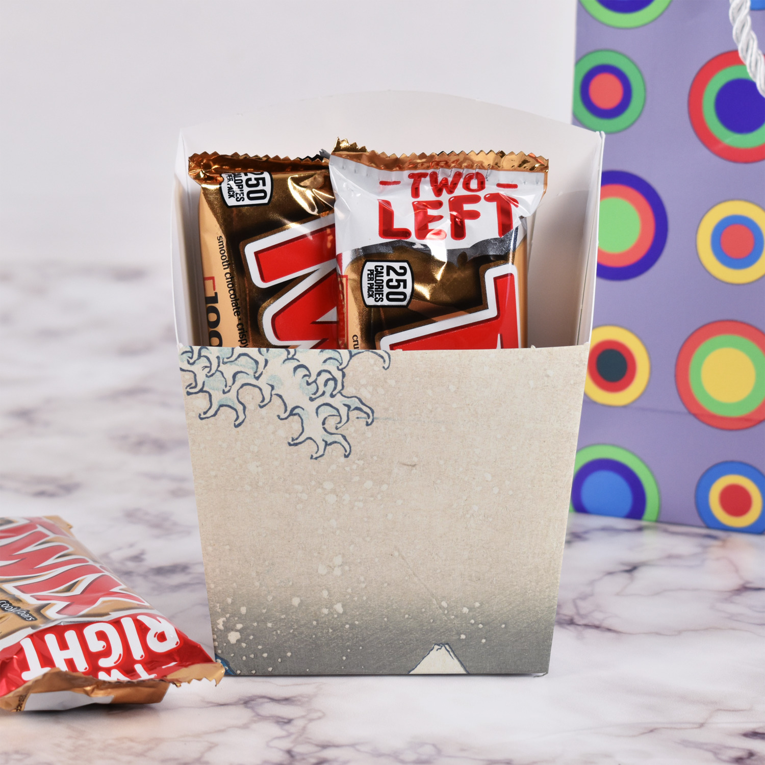 Since it is an open box, it works very well as a party snack cup (instead of plates) for different types of dry snacks and treats such as popcorn, cheezies, pretzels, chips, twizzlers, etc. This box can easily be carried with a drink all in one hand!