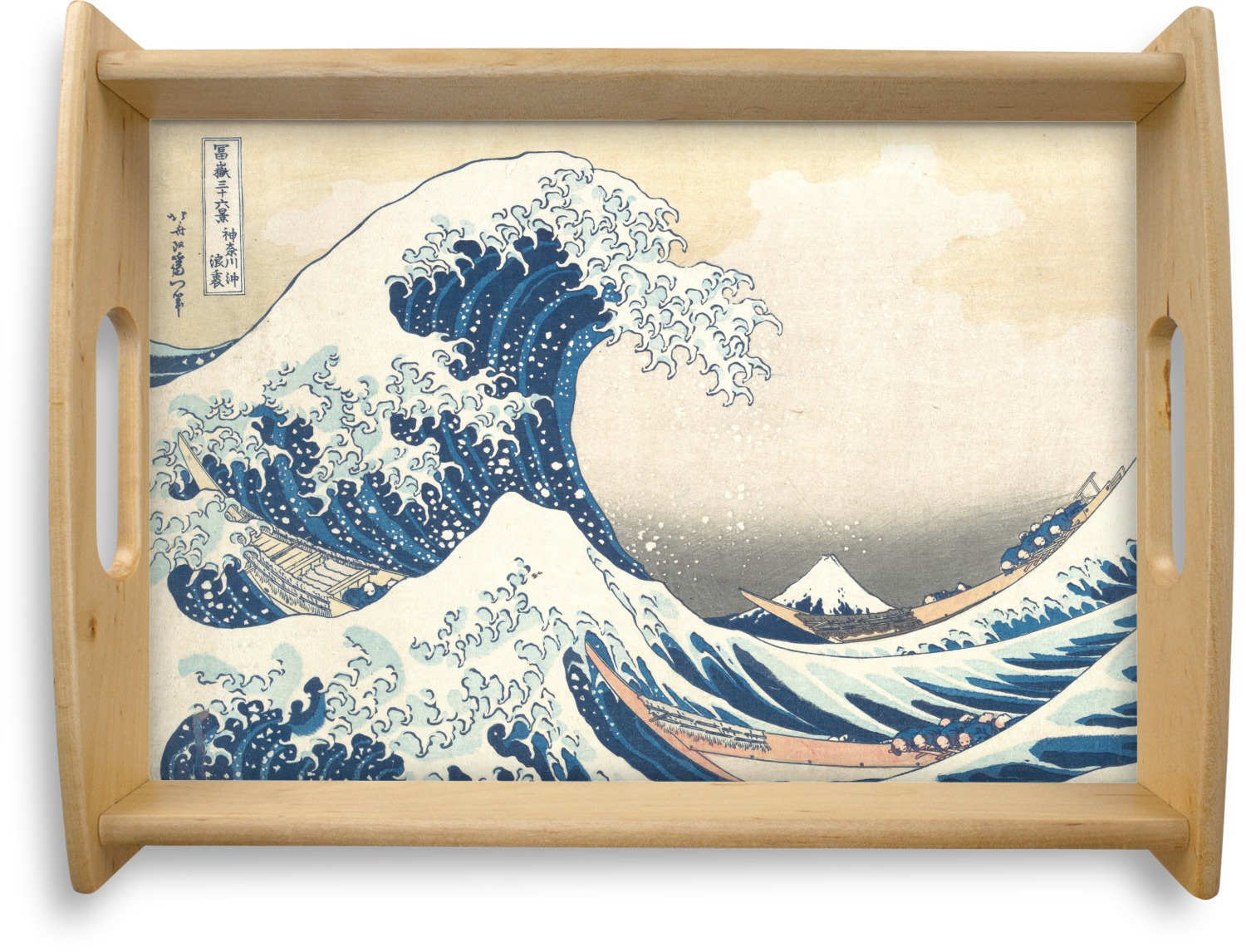 This serving tray with handles features square edges and two rounded sides, creating a very modern look. Each side is fabricated from a beautifully cut, natural wood. The bottom of the interior of the tray displays your customized design in bright, vibrant color. The tray is sold in both a black color and a natural wood look. Each variation of the wood serving tray has two sizes: Small, which is 14" x 10" x 2.25", and Large, which is 19.5" x 13.5" x 2.75".