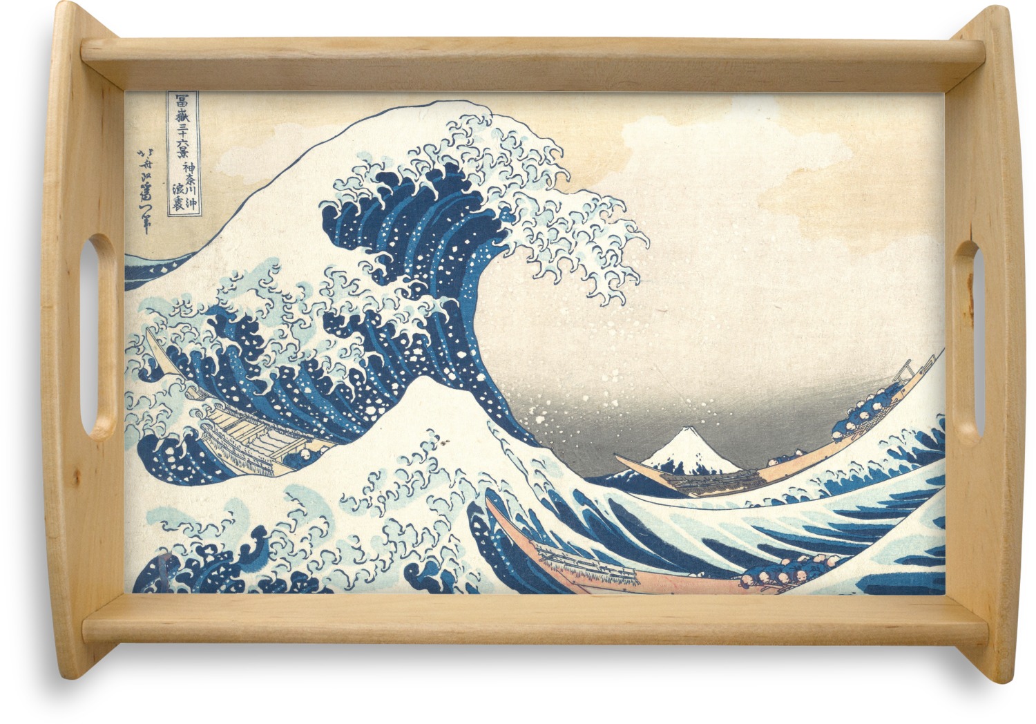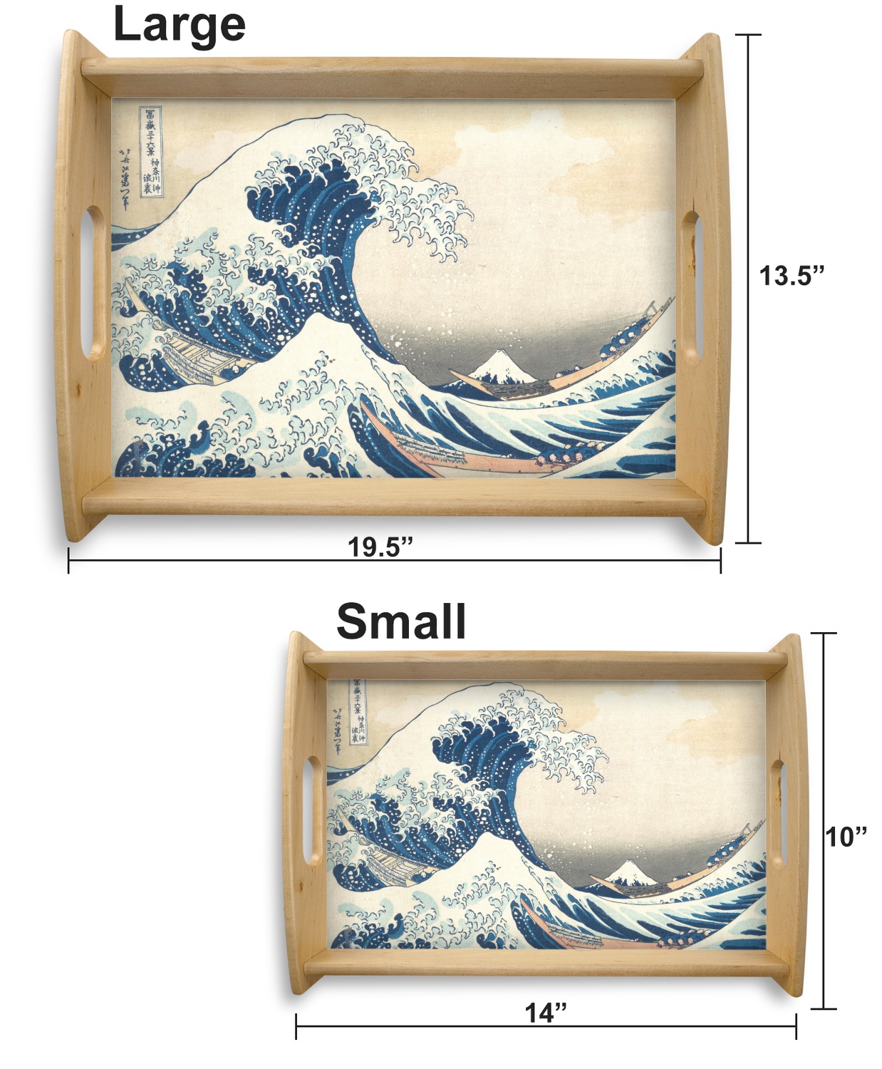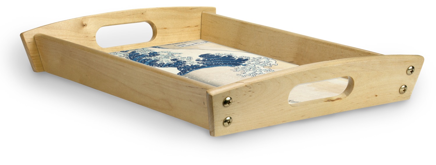 This serving tray with handles features square edges and two rounded sides, creating a very modern look. Each side is fabricated from a beautifully cut, natural wood. The bottom of the interior of the tray displays your customized design in bright, vibrant color. The tray is sold in both a black color and a natural wood look. Each variation of the wood serving tray has two sizes: Small, which is 14" x 10" x 2.25", and Large, which is 19.5" x 13.5" x 2.75".