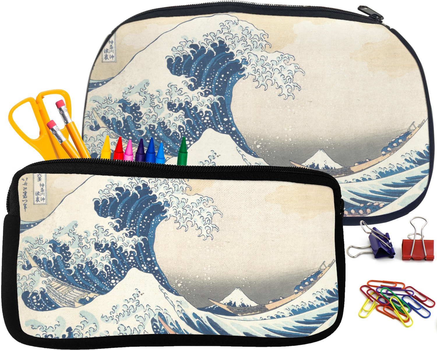 Built from durable neoprene, these pencil pouches, are water resistant, and prevent leaking ink from spilling into your backpack or purse. These custom pencil cases secure with a robust, black zipper. We print your personalized design on the front of this pouch, while the remaining sides a simple black color. These colored pencil cases [880] are sold in two sizes; our smaller version measures at 8.5 by 4.5 inches, while the medium measures at 10.5 by 6.5 inches. The smaller size is more suitable for holding pencils and pens, while our medium size can accommodate pencil sharpeners, scissors, and erasers.