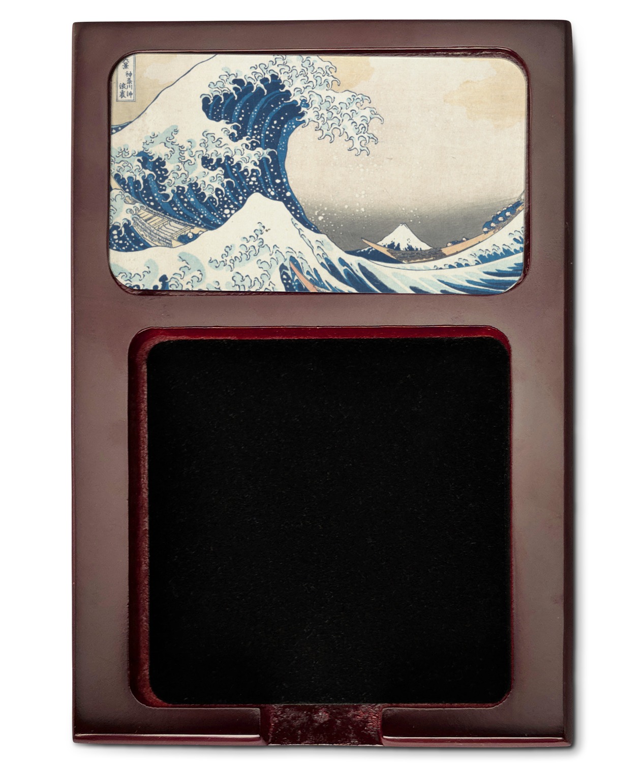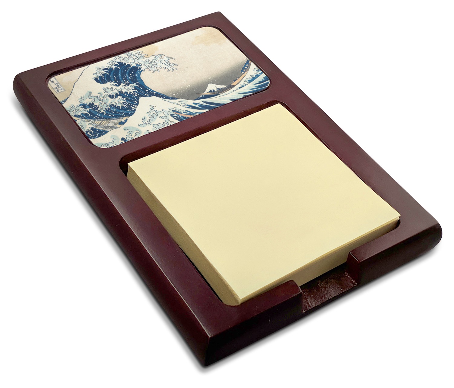 Crafted from a fine mahogany, this post it note holder is in the shade of a dark, cherry color. The dispenser itself is about 4.25 by 6.25 by 0.75 inches. You can place your 3 by 3 inch sticky notes in the indentation below the nameplate. We print your customization onto the nameplate that rests above the velvety indentation.