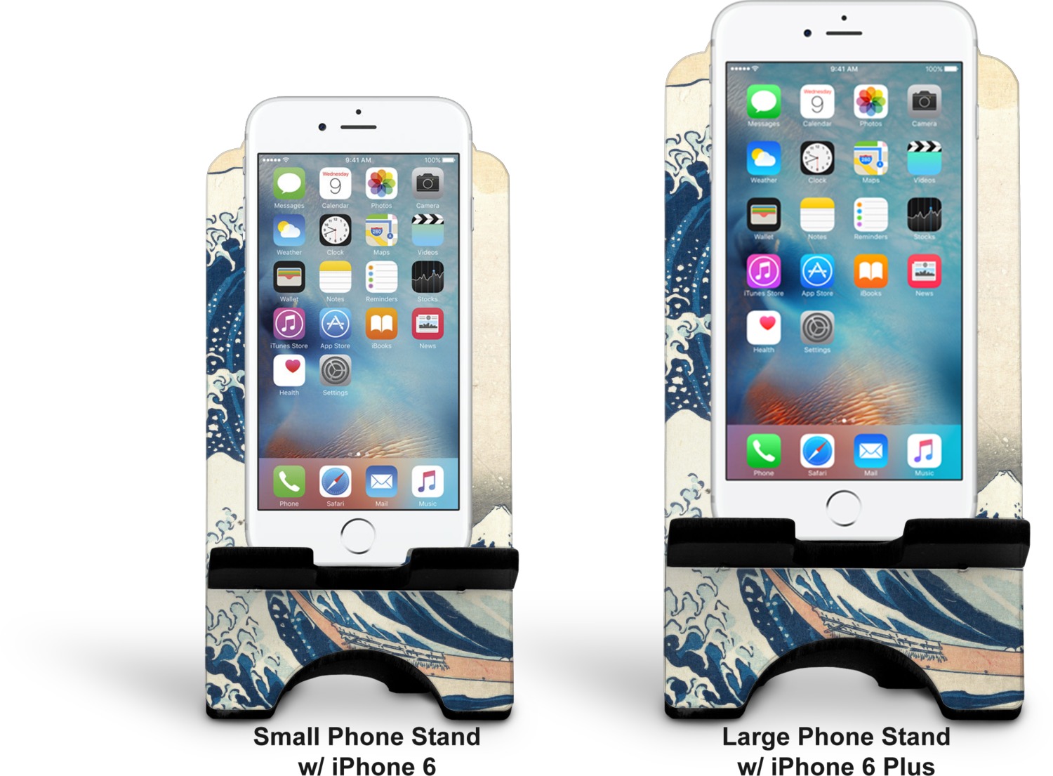 To meet your needs, we offer four variations of this IPhone stand. The backboard of the first version is shaped as a plain, yet sleek rectangle, and is available in two sizes. Our smaller size is approximately 4 by 3.25 by 7 inches, while the larger model is 4 by 3.77 by 8.5 inches. Alongside this model, we also provide you with a more decorative option. The upper part of our second version features a curved edge, for a classy, suave appearance. This phone holder is also sold in two sizes: a smaller version, which is 4 by 3.25 by 7 inches, and our larger model, which is 4 by 3.77 by 8.5 inches. Both models will support large phones, but the larger model is better if you wish to proudly display your personalized design.
