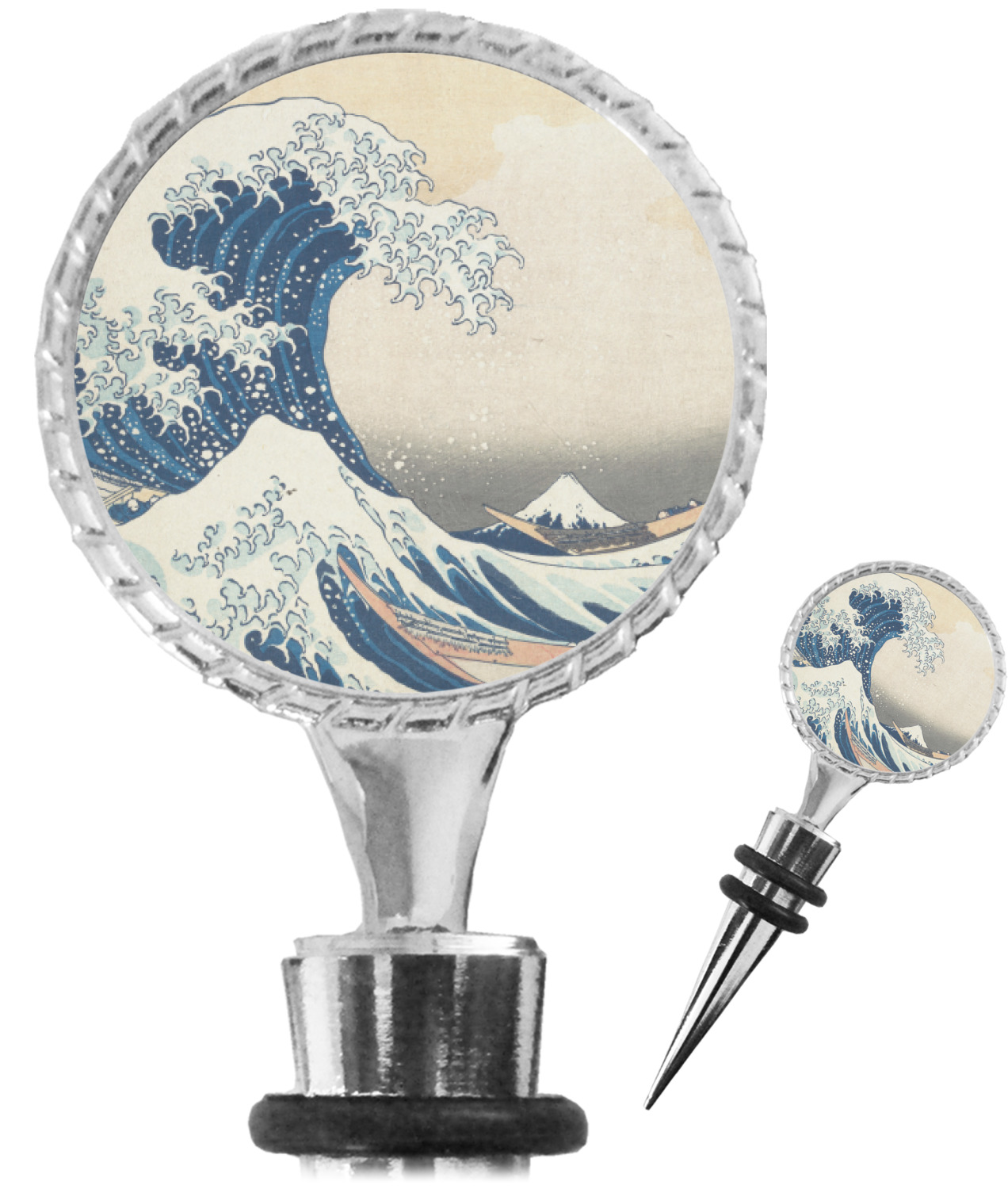 The top part of your bottle stopper is comprised of a zinc ring that displays your customization(s) in its middle, on both sides. The ring is heavy duty, with a bright chrome finish. The body of the wine stoppers have two silicone rings to provide an airtight seal. These wine bottle stoppers measure at 1.625" L x 0.8125" W x 4.625" H; your custom wine stopper is meant to fit into most standard-sized wine bottles.