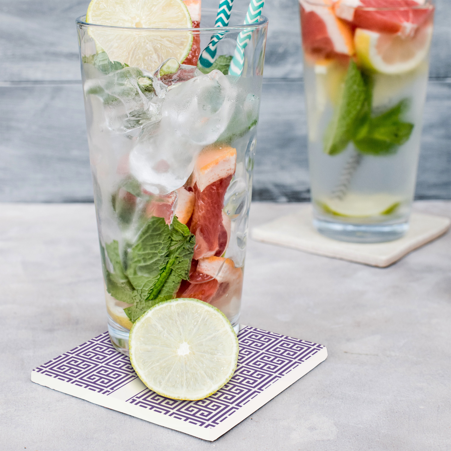 These customized stone coasters are perfect for use with beverages that are served in drinkware that "sweat". When cocktails, sodas, iced tea, water, etc. are served with ice in a regular glasses (non insulated glasses), they release condensation that drips down the outside of the glasses.