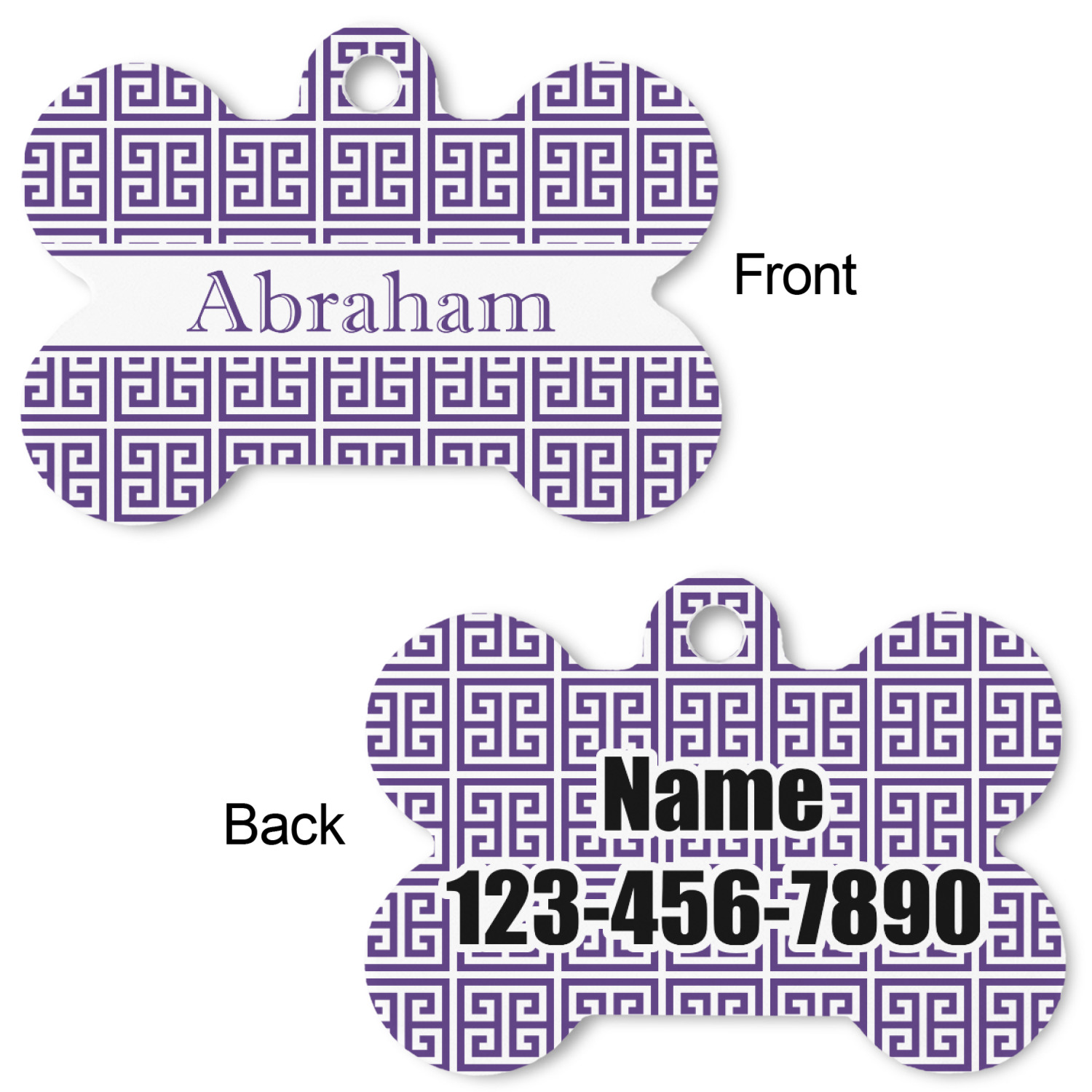 Our default design templates print your dog's personalization on the front and your contact information on the back; however everything is customizable, so you customize the patterns, the colors, the personalization, the contact information etc.