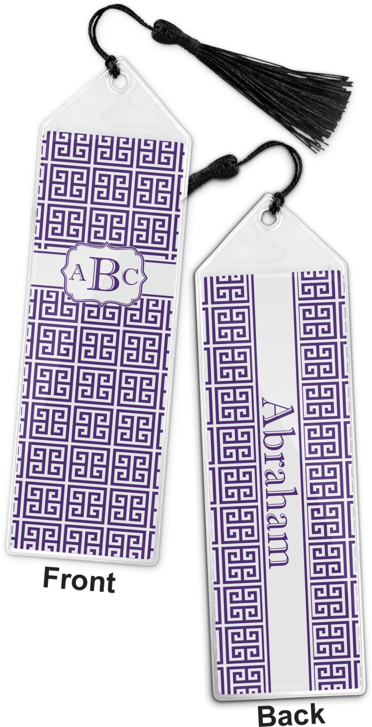 Your personalized bookmark is made of a sturdy, clear vinyl, and is approximately 7.5" x 2.25". We display your personalization on vinyl inserts that are placed on both sides. Accompanying each book marker is a black, fringe tassel that attaches to the reinforced, triangular header.