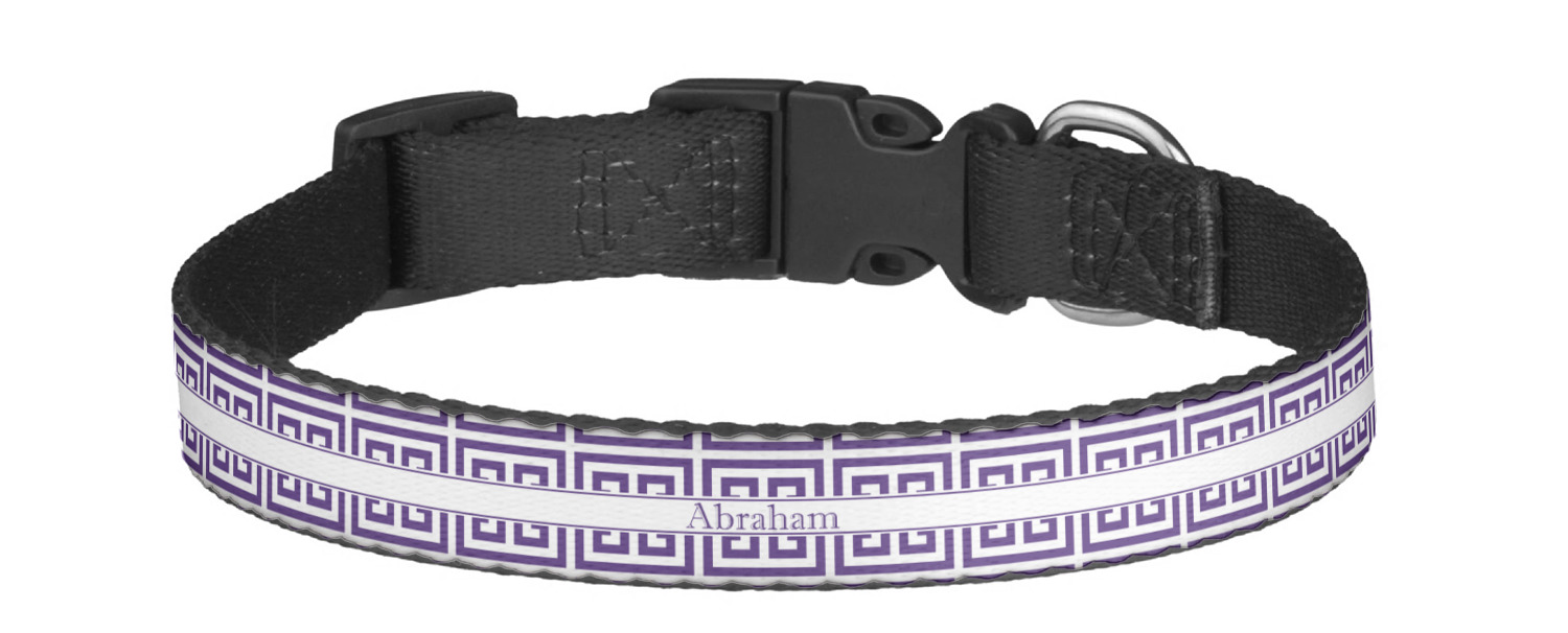 This sturdy collar, made from a durable nylon weave, will outlive your dog's episodes of excited tugging and pulling. Courtesy of its thick plastic buckle and adjuster, this collar is adjustable and accommodating of any dog. Structurally, the collar is a single piece of nylon weave that is sewn together, and features a solid metal loop where you can attach a leash or dog tag. We print and display your dog's name and pattern across the middle of the personalized dog collar.