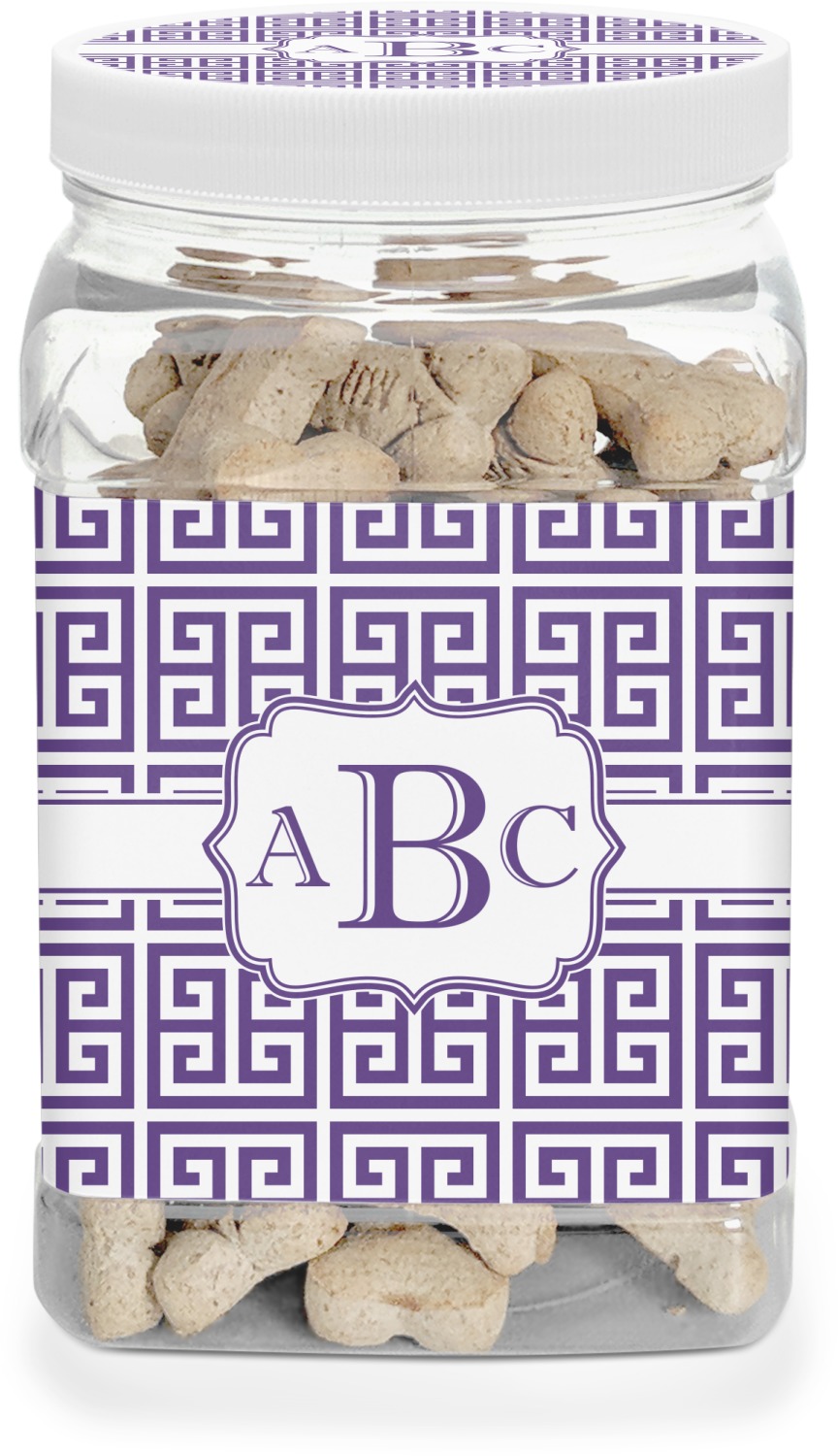 This half gallon jar, made from a sturdy plastic, is the perfect way to keep treats from any naughty pet paws, while still keeping them ready on hand for when your pup performs an impressive trick. This dog cookie jar features a screw-on, white lid that displays your personalized design on a vinyl sticker. We apply another customized sticker that wraps around the front and sides of the jar. Our dog treat jar also has indentations on the rear ends of the sides, which allows for convenient handling, and its square frame allows for easy storage.