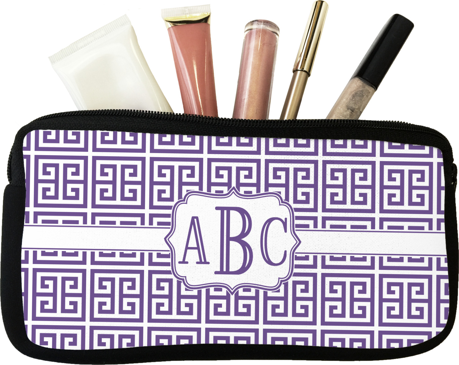 Our personalized makeup bags are available in many different designs, patterns and colors - so you are sure to find one that will love. They are made of neoprene (same material as wet-suits) and thus are water resistant, so spillages in your makeup bag will not end up all over you purse. They are customized on one side and are black on the other side and the zipper is black as well.