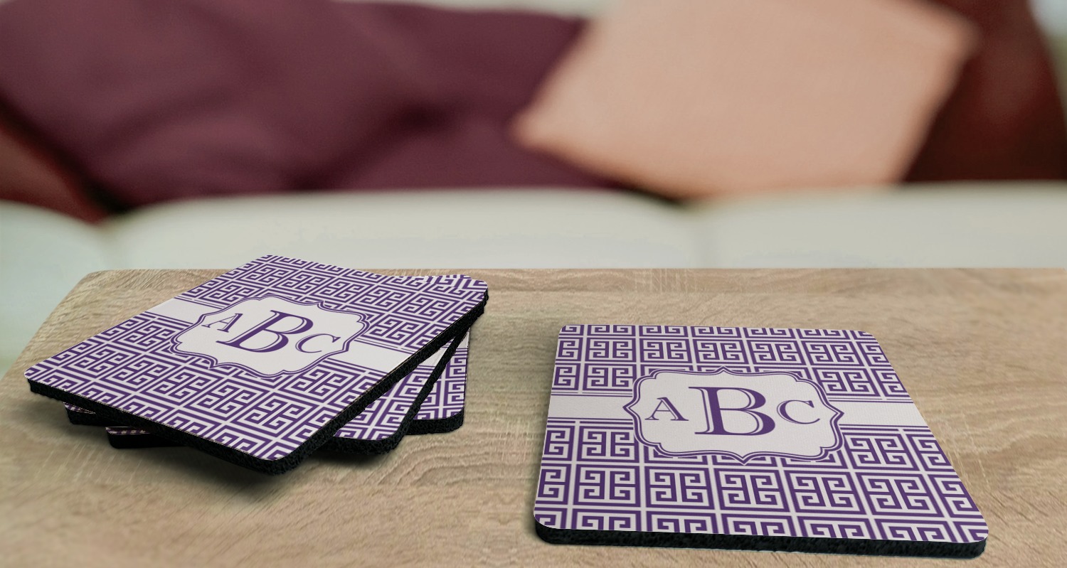 These drink coasters have a smooth, polyester top and a textured, rubber backing on its bottom. The non-slip rubber backing underneath works to keep any spills at bay. At 4 by 4 by 0.25 inches thick, these custom coasters are a suitable size for most drinkware. Your personalization is displayed atop the face of the cup coaster. We sell these rubber coasters in two different shapes: square and round. You can buy each shape as singulars or as a set of 4.