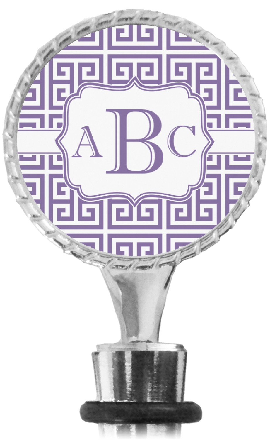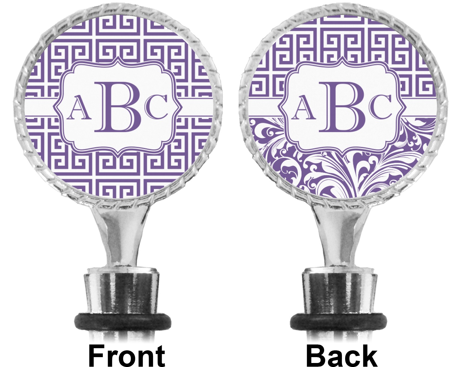 The top part of your bottle stopper is comprised of a zinc ring that displays your customization(s) in its middle, on both sides. The ring is heavy duty, with a bright chrome finish. The body of the wine stoppers have two silicone rings to provide an airtight seal. These wine bottle stoppers measure at 1.625" L x 0.8125" W x 4.625" H; your custom wine stopper is meant to fit into most standard-sized wine bottles.