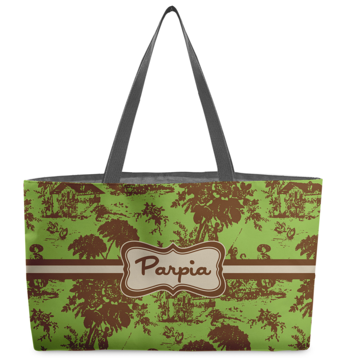These beach totes are handmade here in the USA. Fabric is printed with your design. The tote is then sewn from the fabric pieces, lining and handles added.