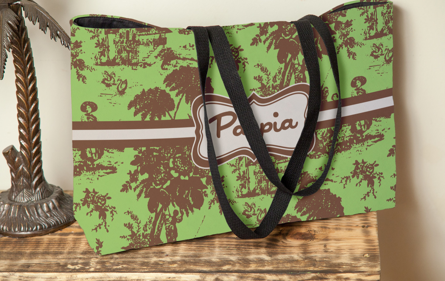 The totes are made from a sturdy canvas material on the outside and are lined with a black poly cotton lining. The beach totes have an approx. 28" black woven handles.
