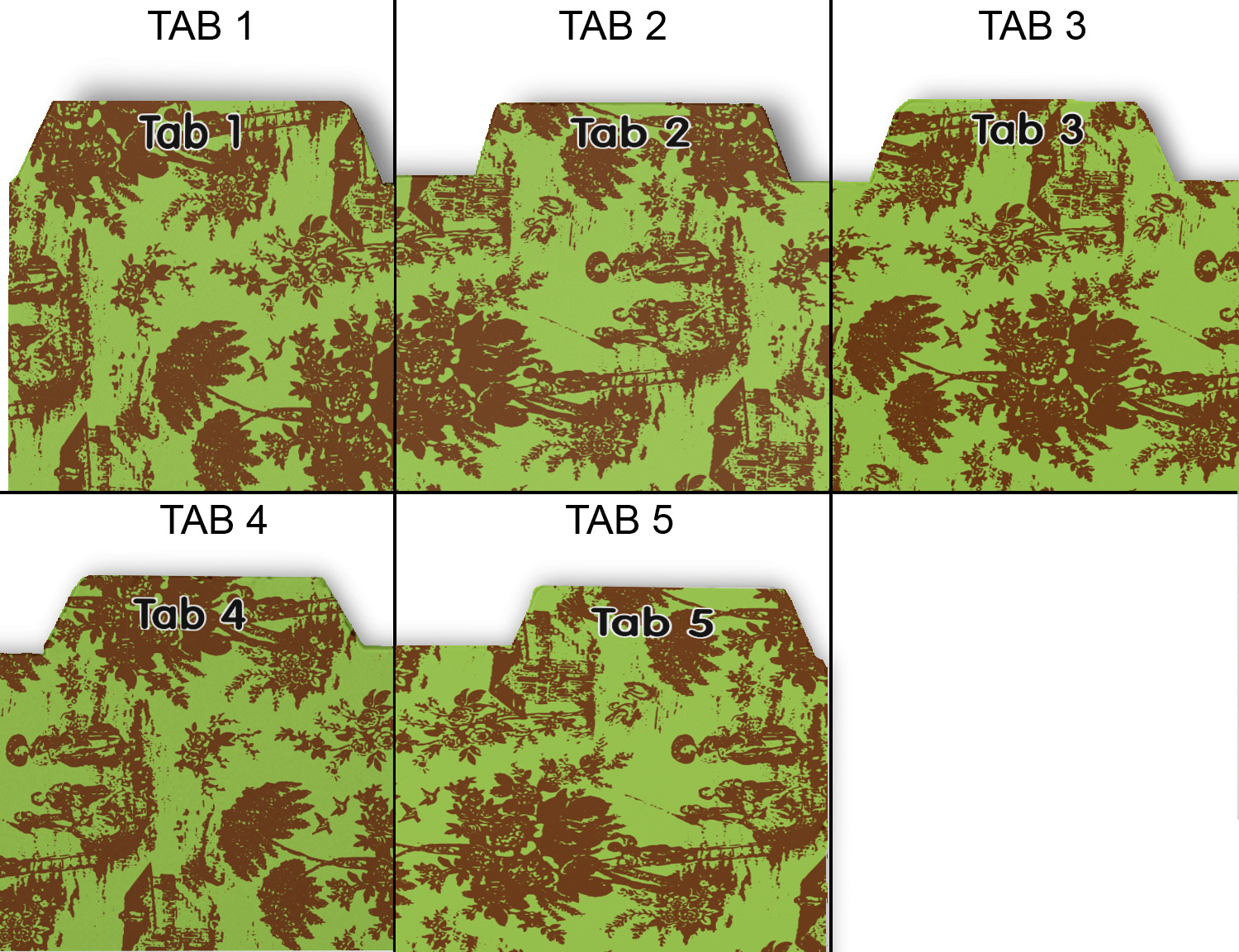 Whether you use binders at school or at work, we have designs to suit all of them. Available in 5 or 6 tab sets, you are sure to find a set to suit your needs. The back of each one is white and can be used to take notes, write vital information on, etc.
