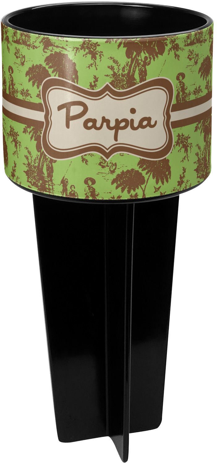 This cup holder has a large stake at its bottom that anchors it to the sand or ground below, while the cup holder rests above the stake. The entire drink holder is made of durable plastic and displays your customization around the cup holder portion. We sell these personalized beach spikers in two different colors: black and white.