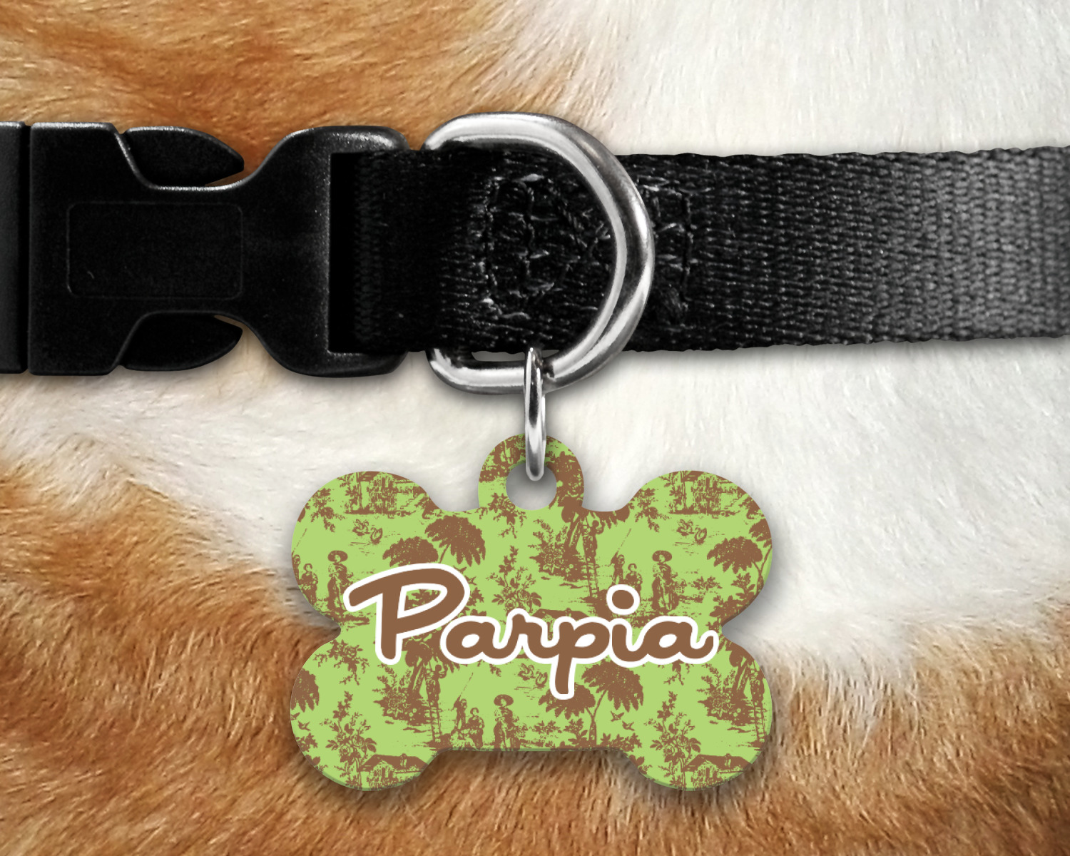 Our default design templates print your dog's personalization on the front and your contact information on the back; however everything is customizable, so you customize the patterns, the colors, the personalization, the contact information etc.