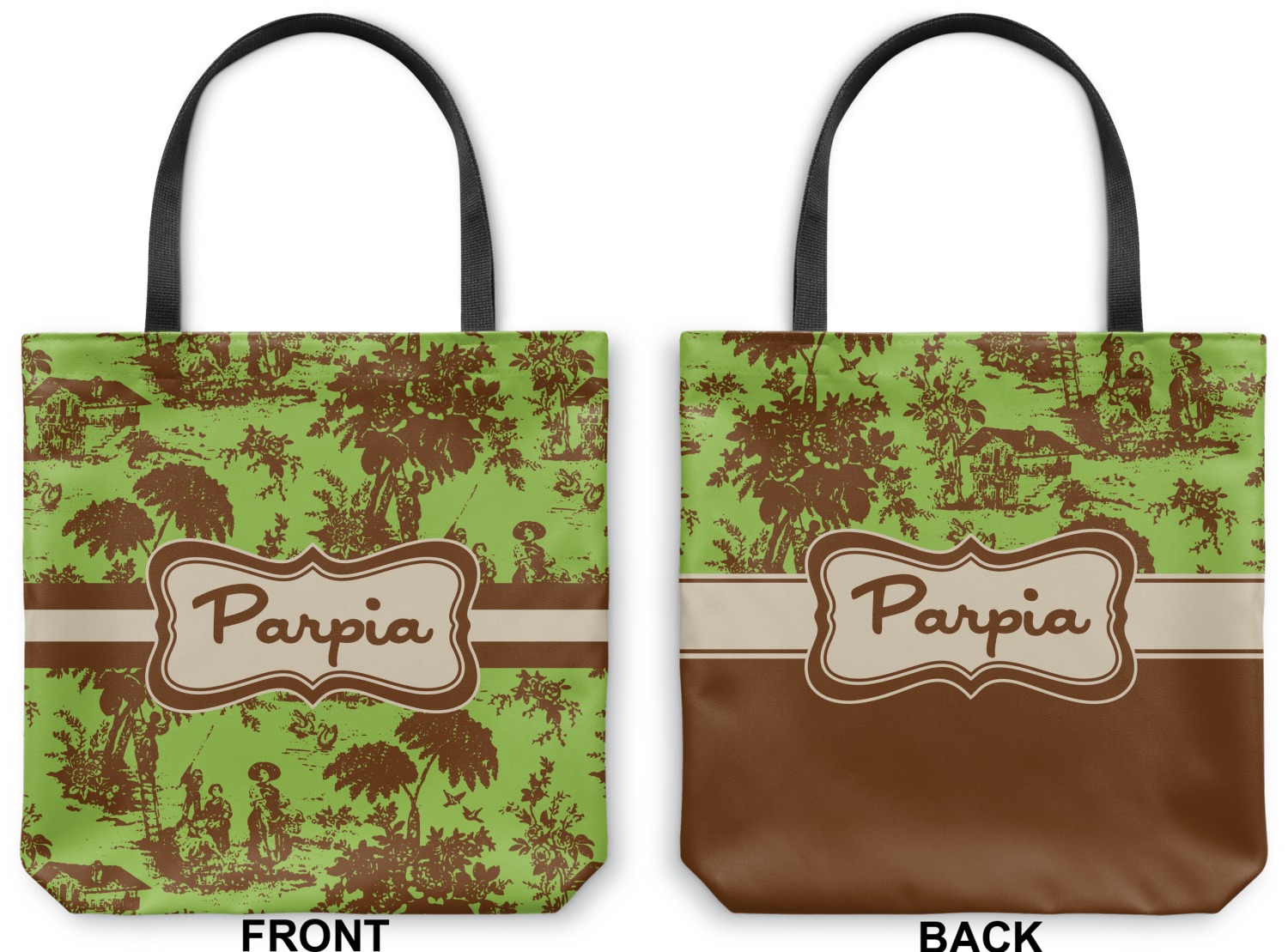 Our totes are made right here in the USA. Your design is printed on canvas fabric; the fabric is then cut and sewn on the sides and on the bottom to add an approximately 3.5 inch gusset. Black cotton handles are sewn in and reinforced. Your tote has a designs on both sides - the designs can be the same or different - the choice is yours. The inside of the tote has a black fused lining.