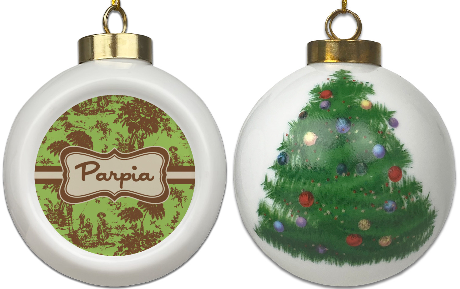 Our Christmas ornaments are a unique ceramic ball shape with a twist as it has a flat face to display your custom design! Select from one of our two design types - Christmas Tree or Poinsettia Garland - to adorn the curved back of your personal design. Each ornament measures 3H x 2.5W x 2D accompanied with a gold string accent for finishing touches to hang on your beautiful Christmas tree!