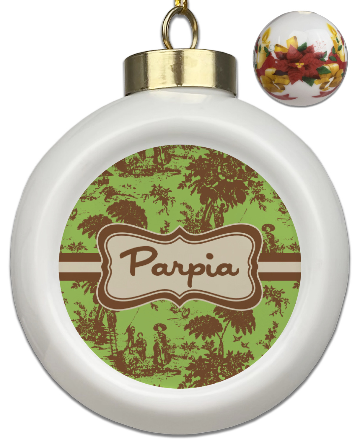 Our Christmas ornaments are a unique ceramic ball shape with a twist as it has a flat face to display your custom design! Select from one of our two design types - Christmas Tree or Poinsettia Garland - to adorn the curved back of your personal design. Each ornament measures 3H x 2.5W x 2D accompanied with a gold string accent for finishing touches to hang on your beautiful Christmas tree!