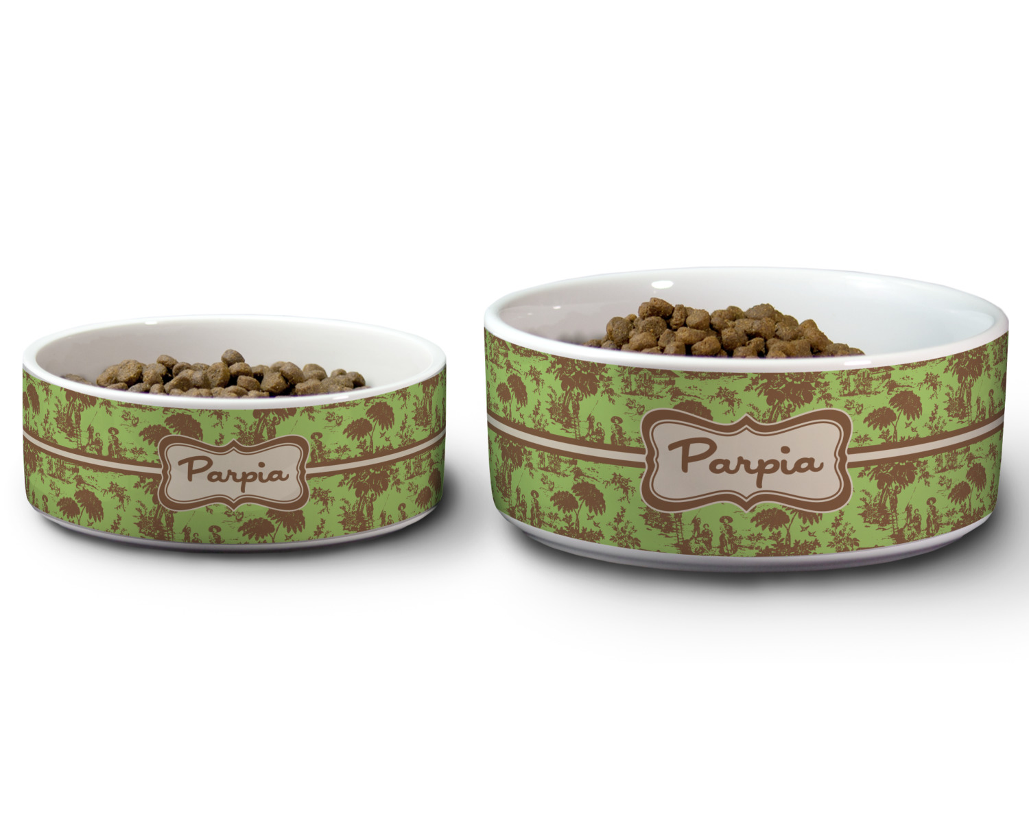 We carry these custom dog bowls in two available sizes: medium and large.The medium is 6 inches in diameter and 2.5 inches tall, and can therefore suit pets who eat up to 2.5 cups of food per meal. The large pet bowl is 7 inches in diameter and 3 inches tall, and suits pets who require up to 4.5 cups of food per meal.