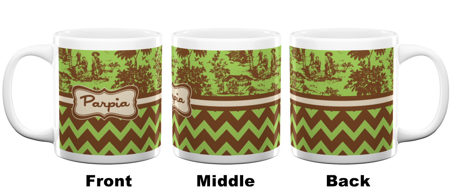 Old world toile just got dressed up. Toile has been around forever but we have taken a centuries old design and brought it to the present and beyond. We took the traditional toile design and modernized it by using brown and green. The toile pattern on top is created in brown which pops on a backdrop of green. On the bottom we have used the very modern chevron pattern in the same green and brown.