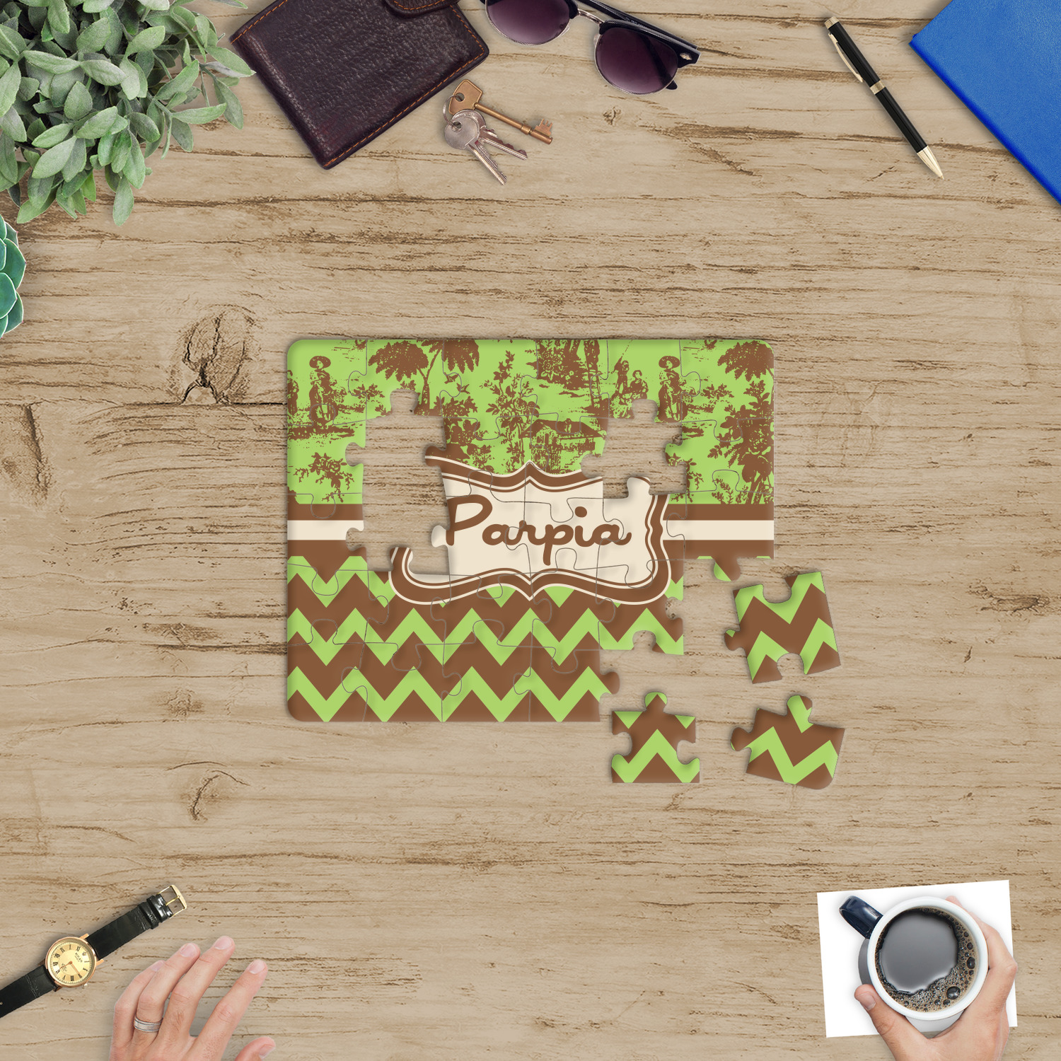 Depending on the look you are trying to achieve, you can add; a thematic pattern or background, with a photo in a frame and text or personalization to your puzzle. Basically if you can imagine it, you can design it!