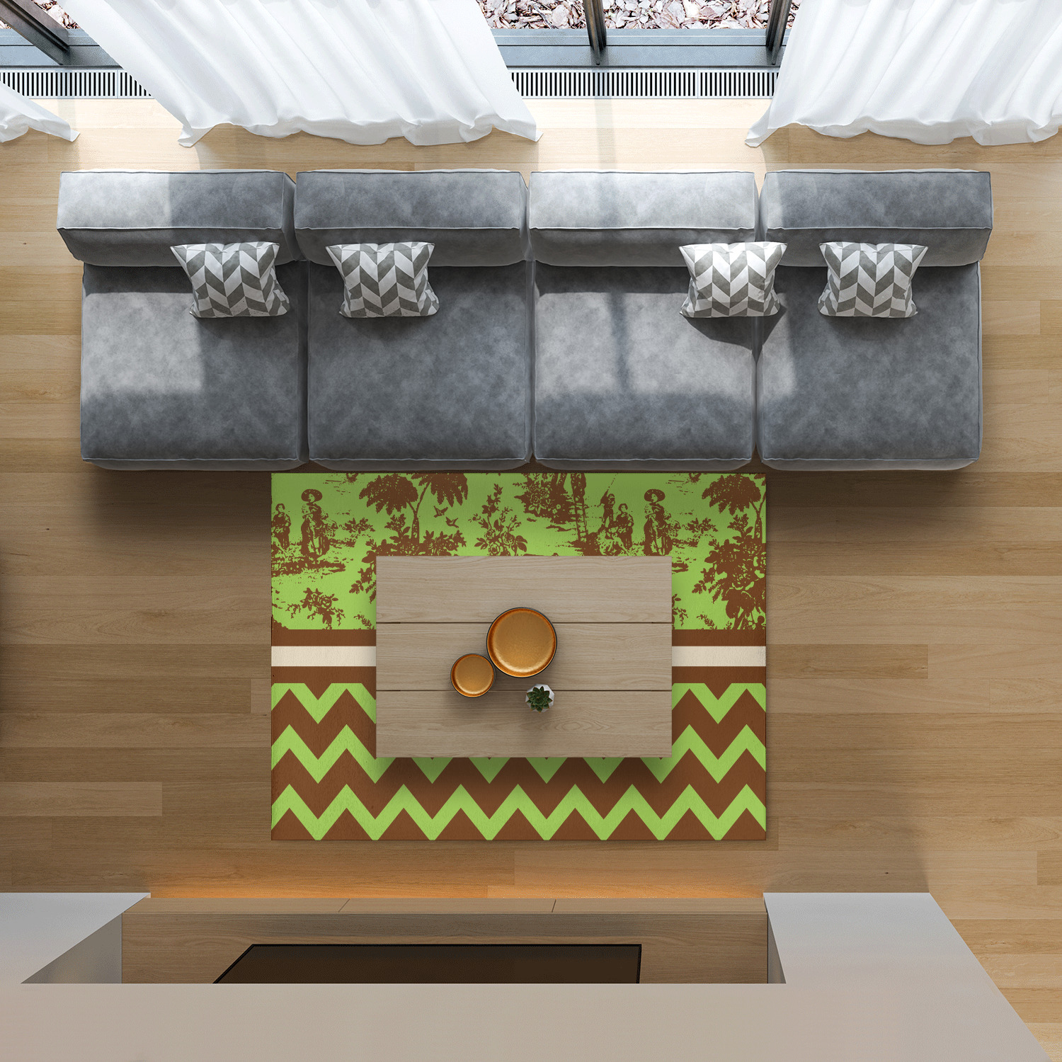 Old world toile just got dressed up. Toile has been around forever but we have taken a centuries old design and brought it to the present and beyond. We took the traditional toile design and modernized it by using brown and green. The toile pattern on top is created in brown which pops on a backdrop of green. On the bottom we have used the very modern chevron pattern in the same green and brown.