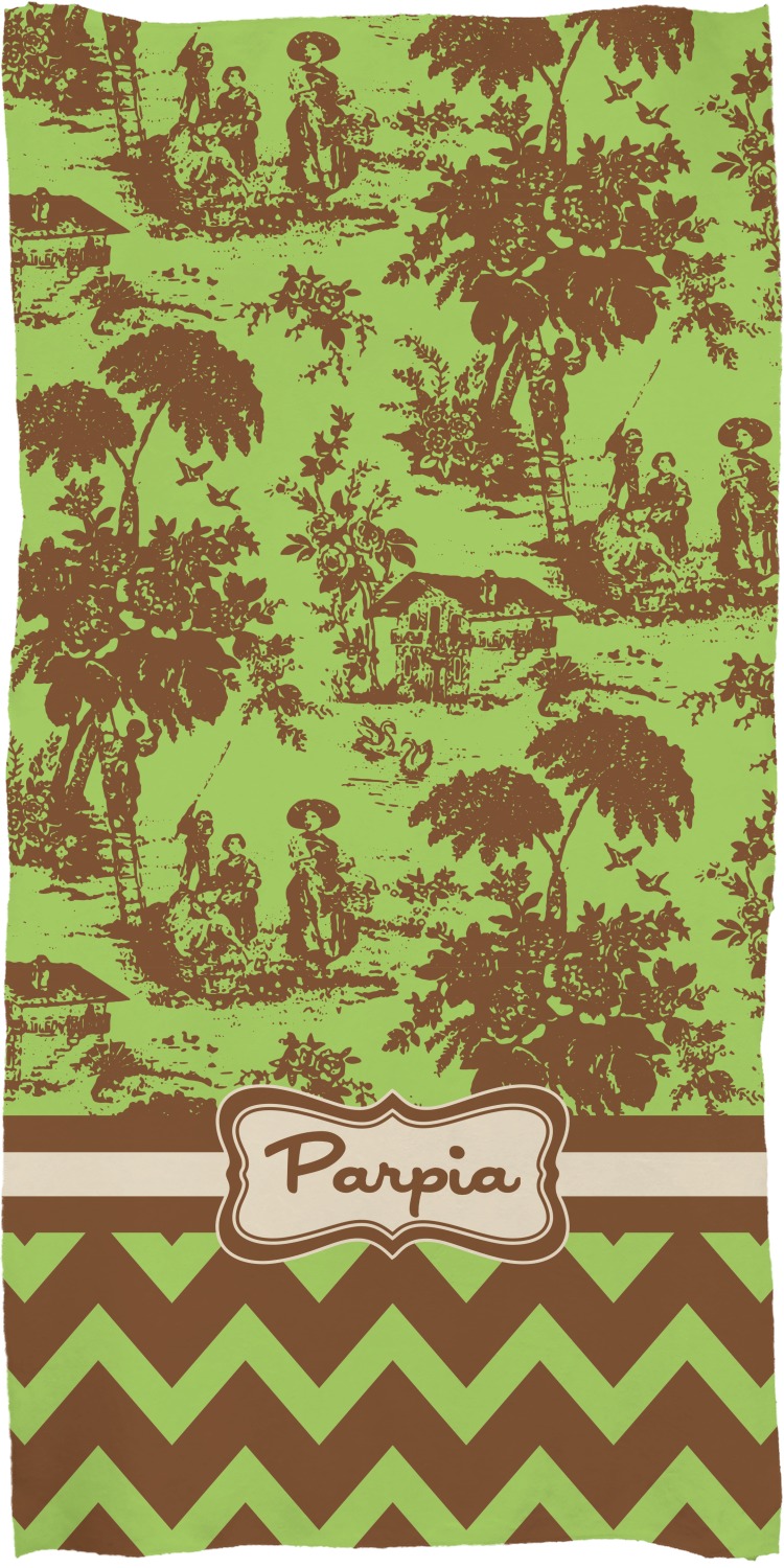 These customized bath towels are slightly larger than your standard towel and are the ideal size for wrapping around your body. They measure approximately 60" x 30". Your customization is displayed across the entire front face of the towel, while the back is white.