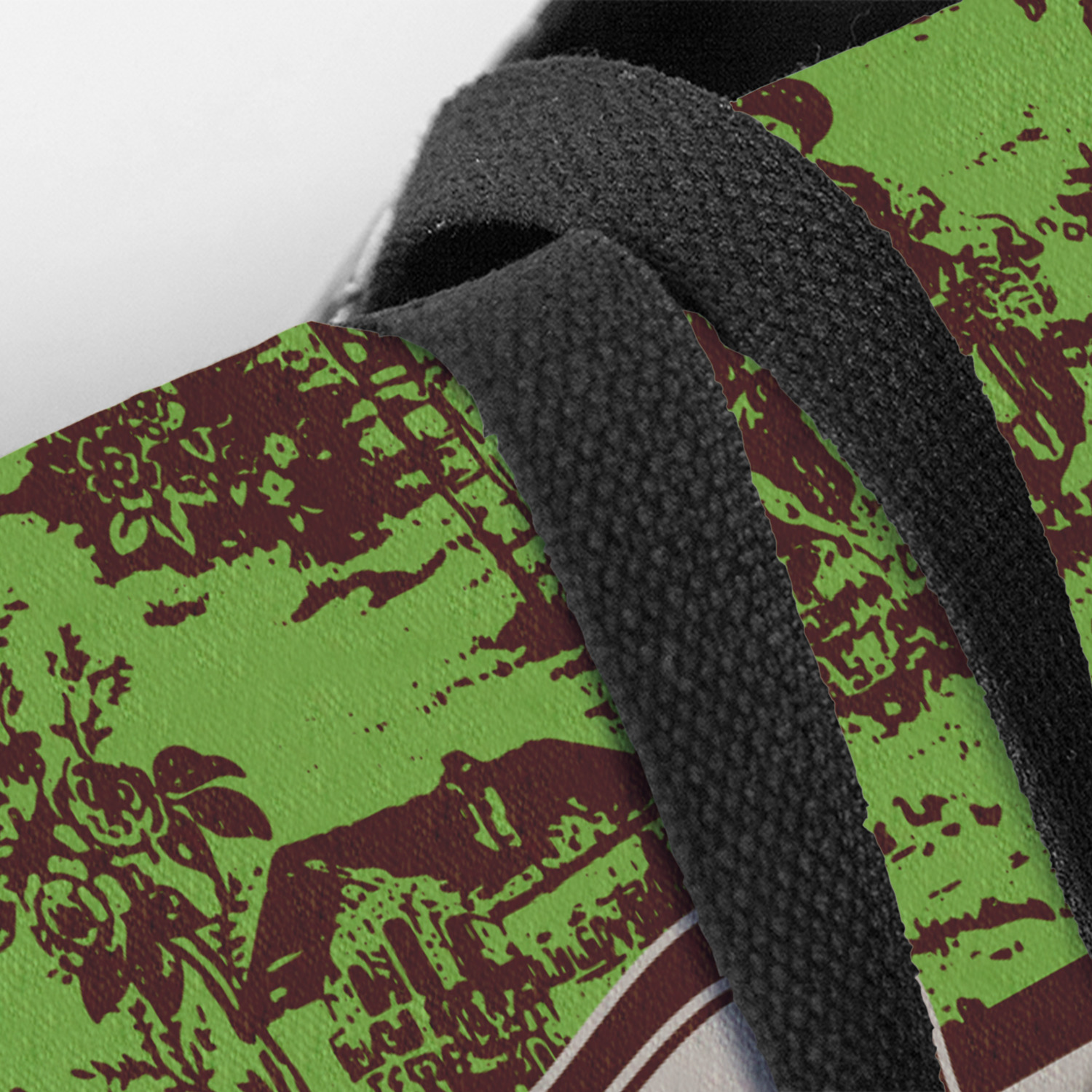 Old world toile just got dressed up. Toile has been around forever but we have taken a centuries old design and brought it to the present and beyond. We took the traditional toile design and modernized it by using brown and green. The toile pattern on top is created in brown which pops on a backdrop of green. On the bottom we have used the very modern chevron pattern in the same green and brown.