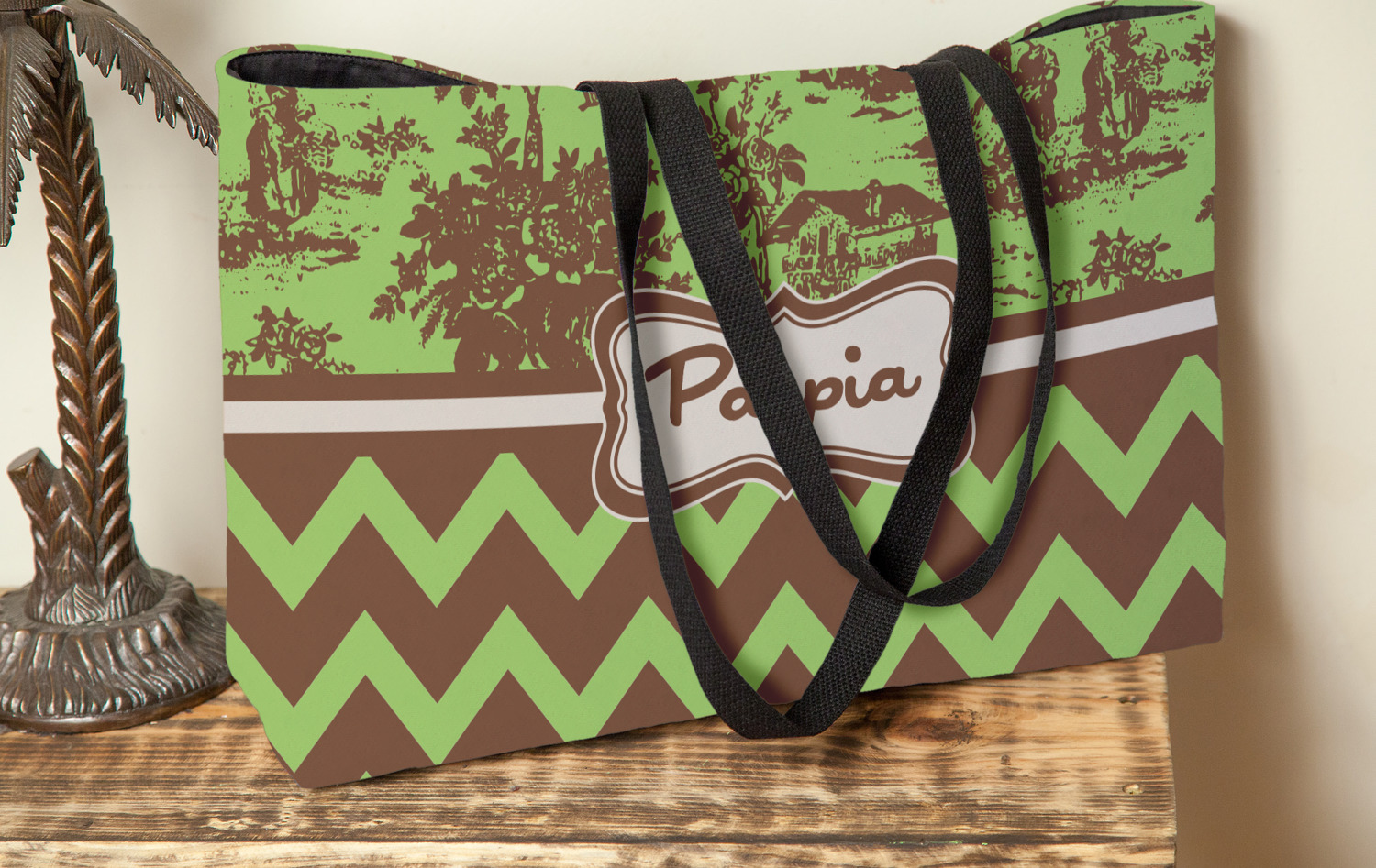 These beach totes are handmade here in the USA. Fabric is printed with your design. The tote is then sewn from the fabric pieces, lining and handles added.