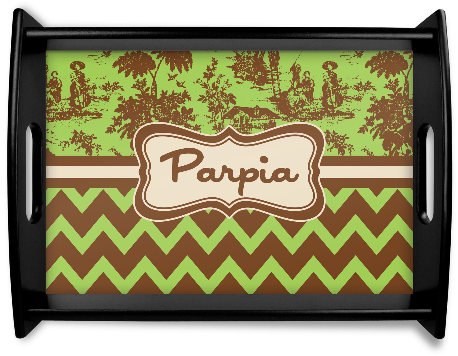 This serving tray with handles features square edges and two rounded sides, creating a very modern look. Each side is fabricated from a beautifully cut, natural wood. The bottom of the interior of the tray displays your customized design in bright, vibrant color. The tray is sold in both a black color and a natural wood look. Each variation of the wood serving tray has two sizes: Small, which is 14" x 10" x 2.25", and Large, which is 19.5" x 13.5" x 2.75".