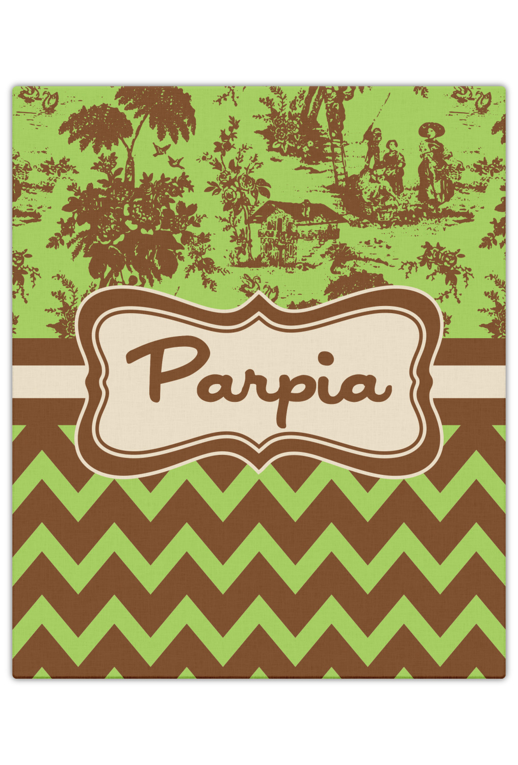 Old world toile just got dressed up. Toile has been around forever but we have taken a centuries old design and brought it to the present and beyond. We took the traditional toile design and modernized it by using brown and green. The toile pattern on top is created in brown which pops on a backdrop of green. On the bottom we have used the very modern chevron pattern in the same green and brown.