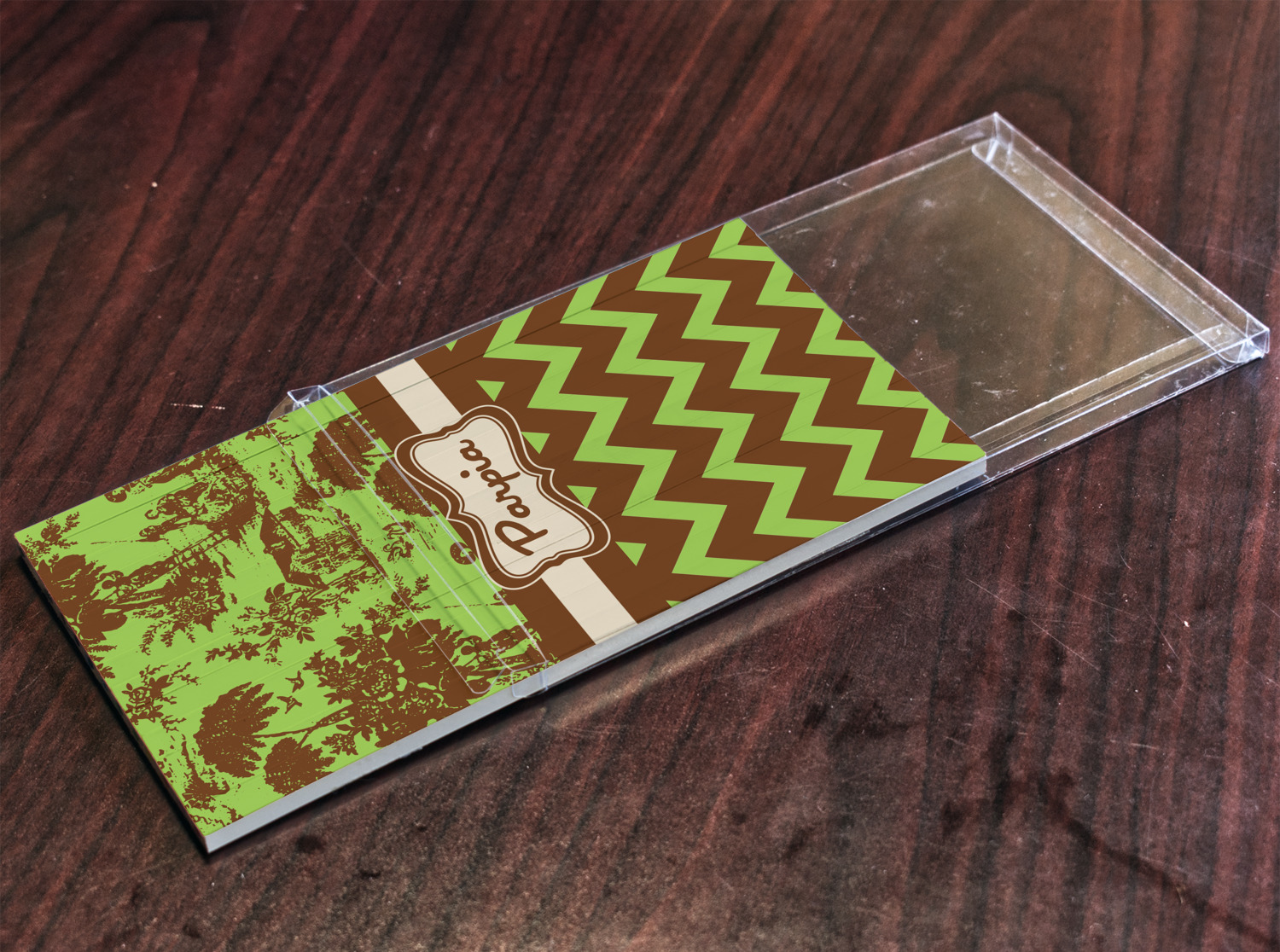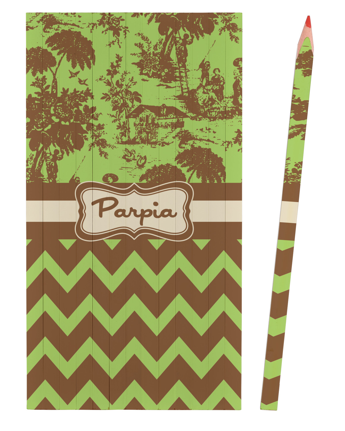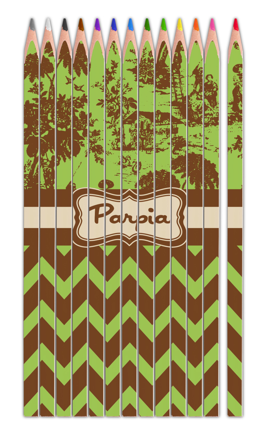 Old world toile just got dressed up. Toile has been around forever but we have taken a centuries old design and brought it to the present and beyond. We took the traditional toile design and modernized it by using brown and green. The toile pattern on top is created in brown which pops on a backdrop of green. On the bottom we have used the very modern chevron pattern in the same green and brown.