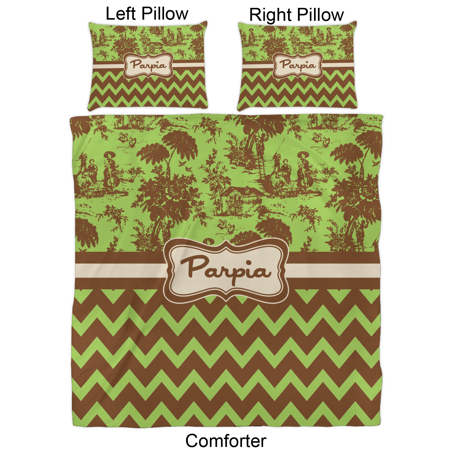 Old world toile just got dressed up. Toile has been around forever but we have taken a centuries old design and brought it to the present and beyond. We took the traditional toile design and modernized it by using brown and green. The toile pattern on top is created in brown which pops on a backdrop of green. On the bottom we have used the very modern chevron pattern in the same green and brown.