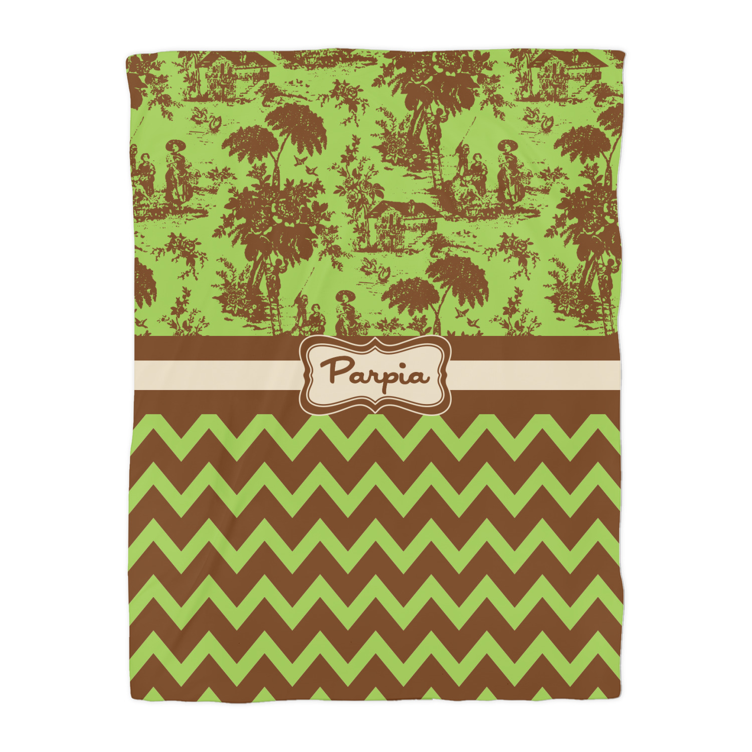 Old world toile just got dressed up. Toile has been around forever but we have taken a centuries old design and brought it to the present and beyond. We took the traditional toile design and modernized it by using brown and green. The toile pattern on top is created in brown which pops on a backdrop of green. On the bottom we have used the very modern chevron pattern in the same green and brown.