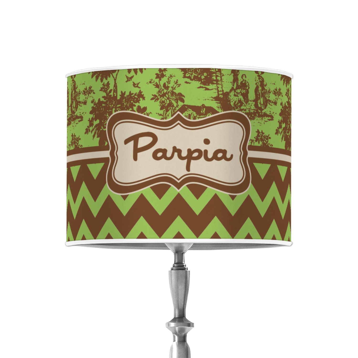 Old world toile just got dressed up. Toile has been around forever but we have taken a centuries old design and brought it to the present and beyond. We took the traditional toile design and modernized it by using brown and green. The toile pattern on top is created in brown which pops on a backdrop of green. On the bottom we have used the very modern chevron pattern in the same green and brown.