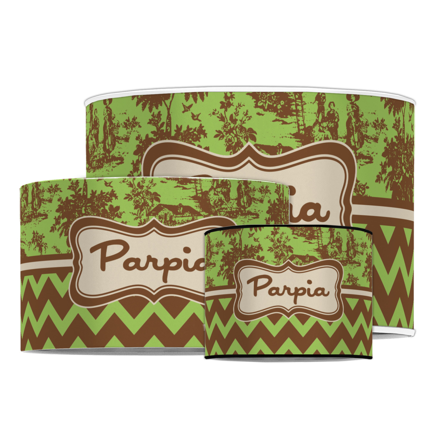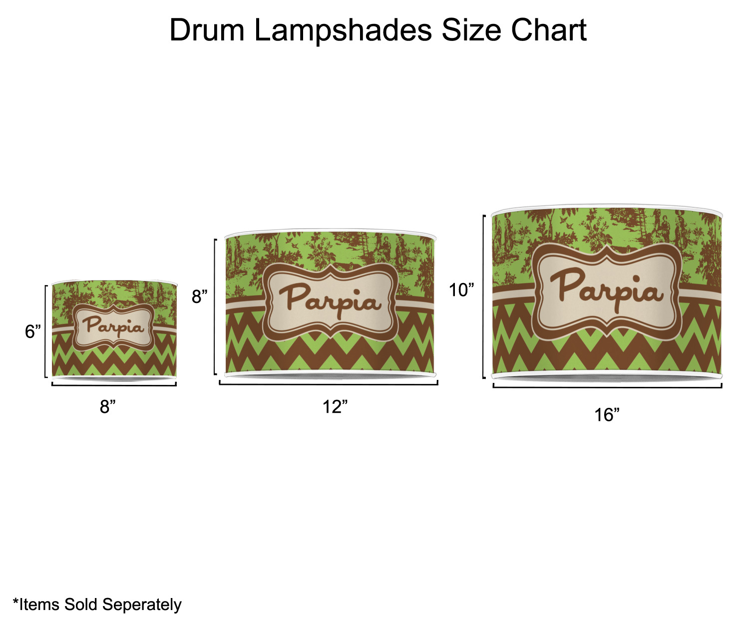 Our customized lamp shades also come in 3 different sizes: 8", 12" and 16", measuring at 8" in diameter by 6" tall, 12" in diameter by 8" tall, and 16" in diameter by 10" tall, respectively.