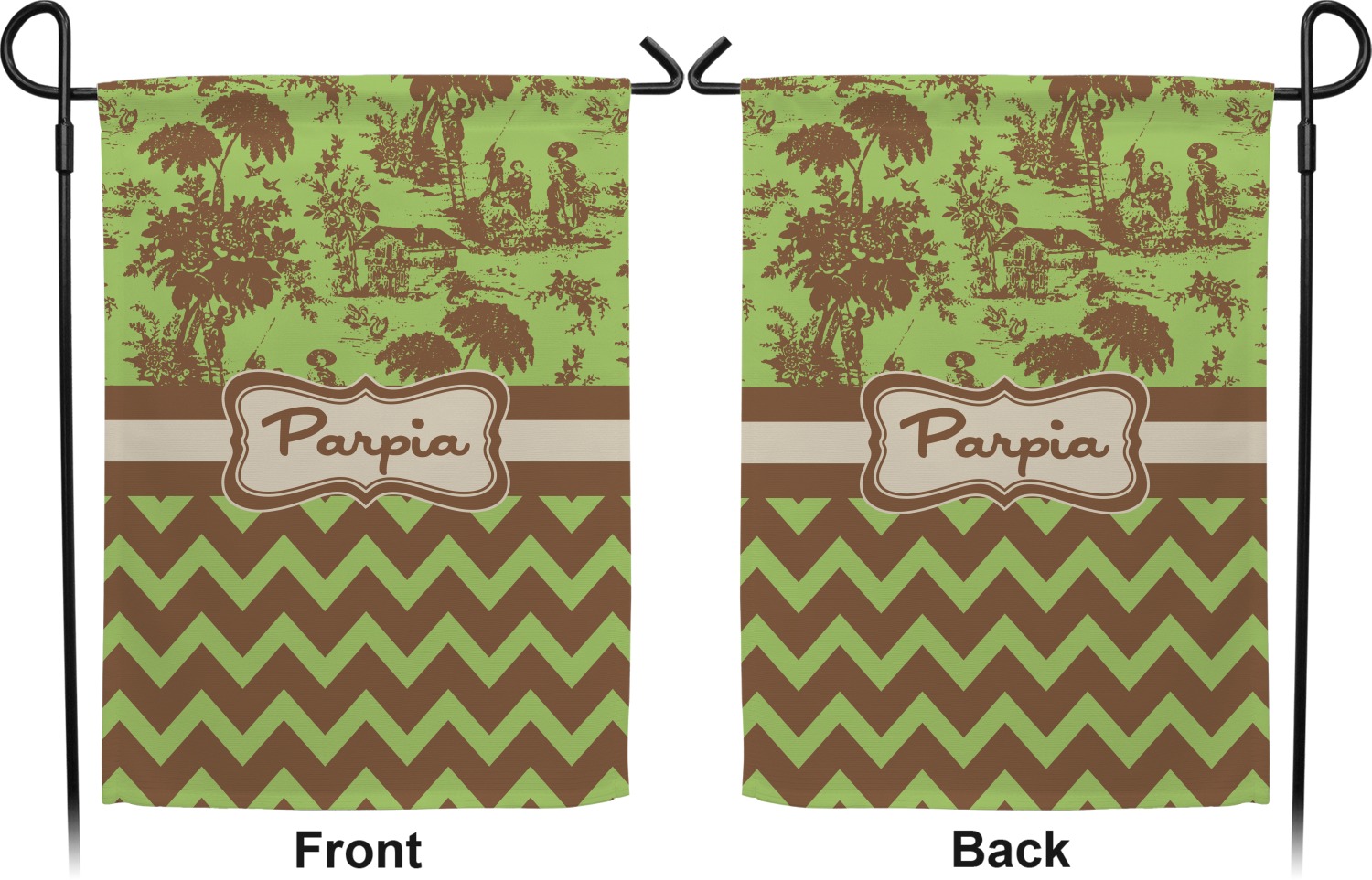 These custom garden flags are made of a durable, double-ply, polyester weave, allowing them to withstand the elements year round. The small flags measure at approximately 12 by 18 inches. The large flags measure out to 28 by 37 inches. You can order these decorative flags with your customization printed on the front only, or the front and back.