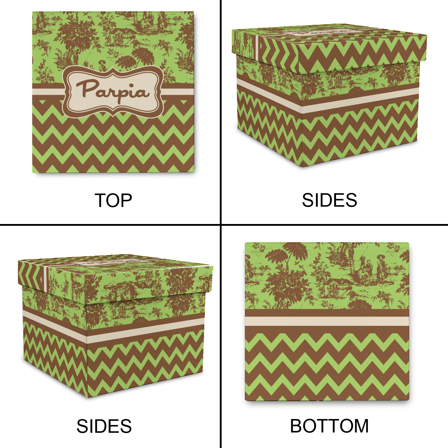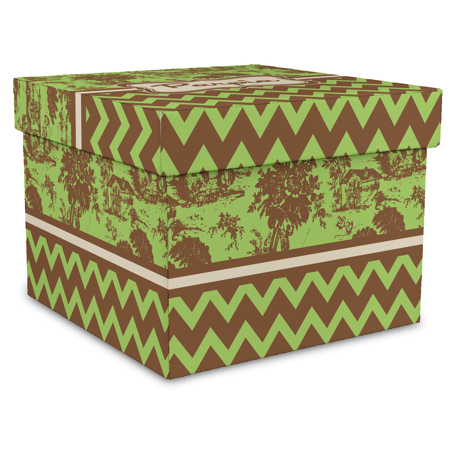 Old world toile just got dressed up. Toile has been around forever but we have taken a centuries old design and brought it to the present and beyond. We took the traditional toile design and modernized it by using brown and green. The toile pattern on top is created in brown which pops on a backdrop of green. On the bottom we have used the very modern chevron pattern in the same green and brown.
